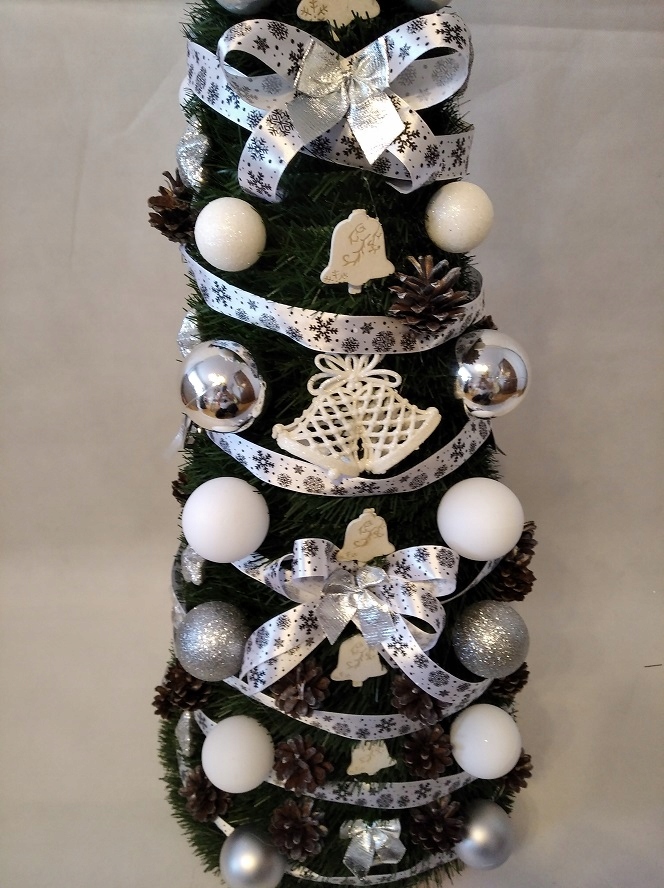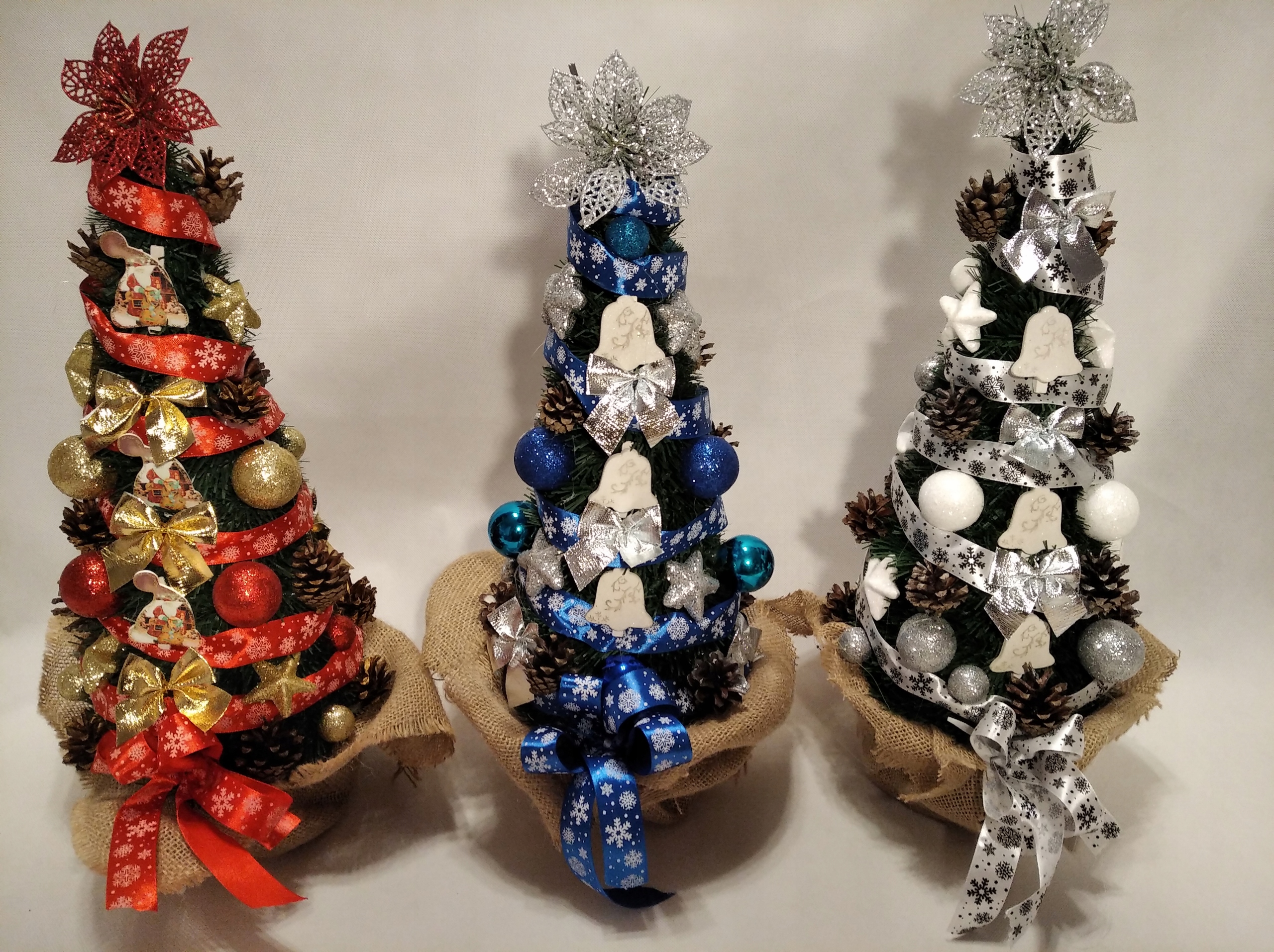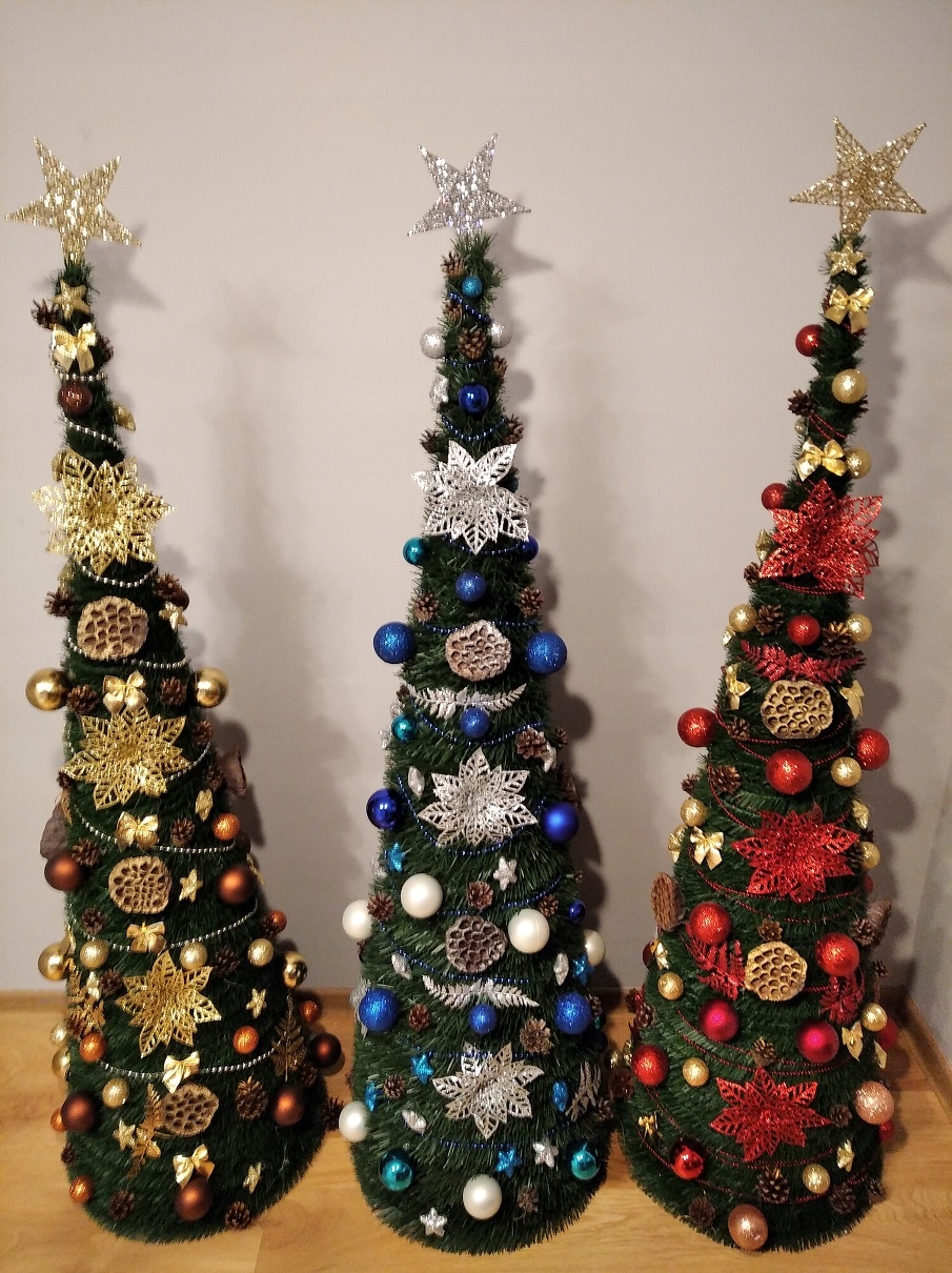 Мы изготавливаем елки с украшениями следующих цветов: серебристый, белый, золотой, синий, красный, коричневый, зеленый, фиолетовый или смешанный, например золотой. и красный.