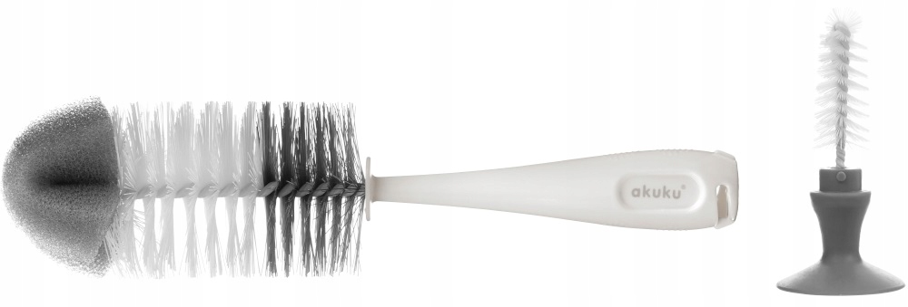 Щётка с мягкой губкой помогает тщательно очищать как бутылочки, так и пустышки. Самостоящий, на присоске, что позволяет прикрепить его к гладким поверхностям для облегчения сушки. В ручке спрятана небольшая щеточка для чистки сосок.