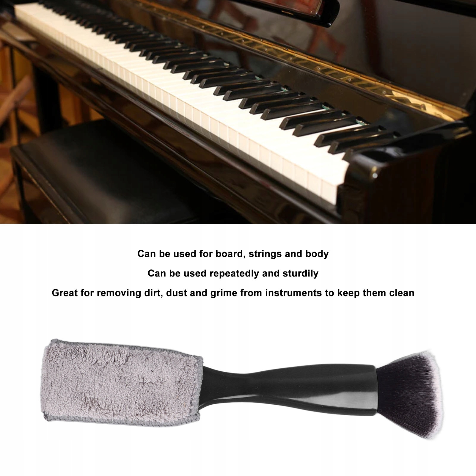 1. Универсальность: щетка для чистки инструментов подходит для всех типов инструментов и может использоваться для фортепиано, гитары, их доски, струн и корпуса.