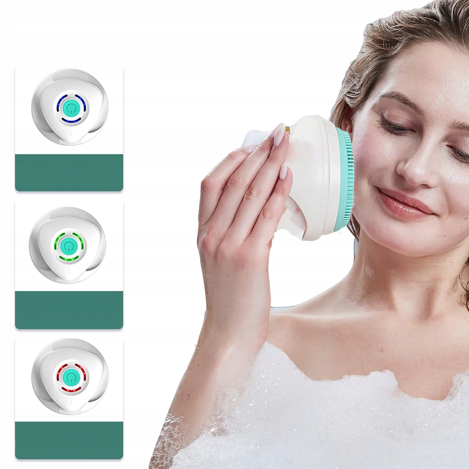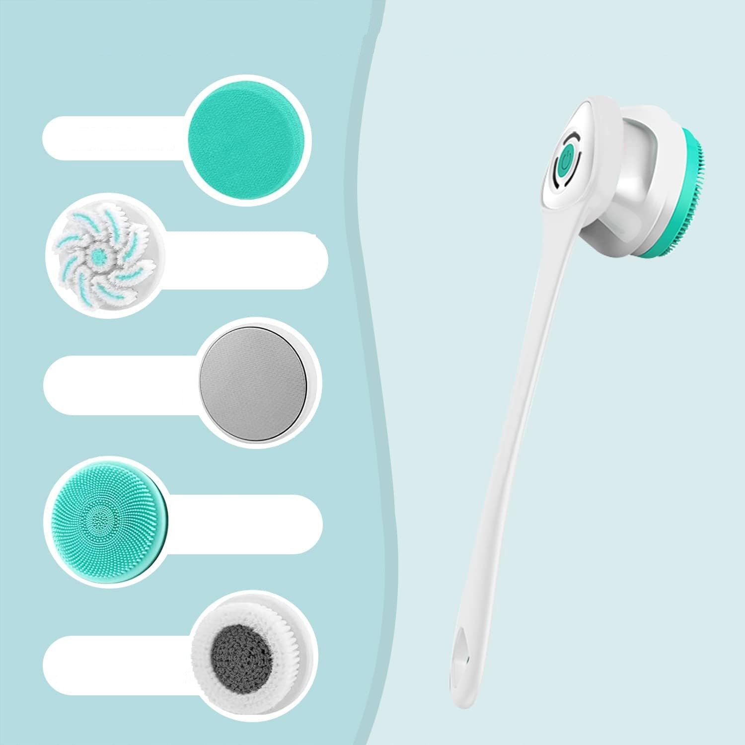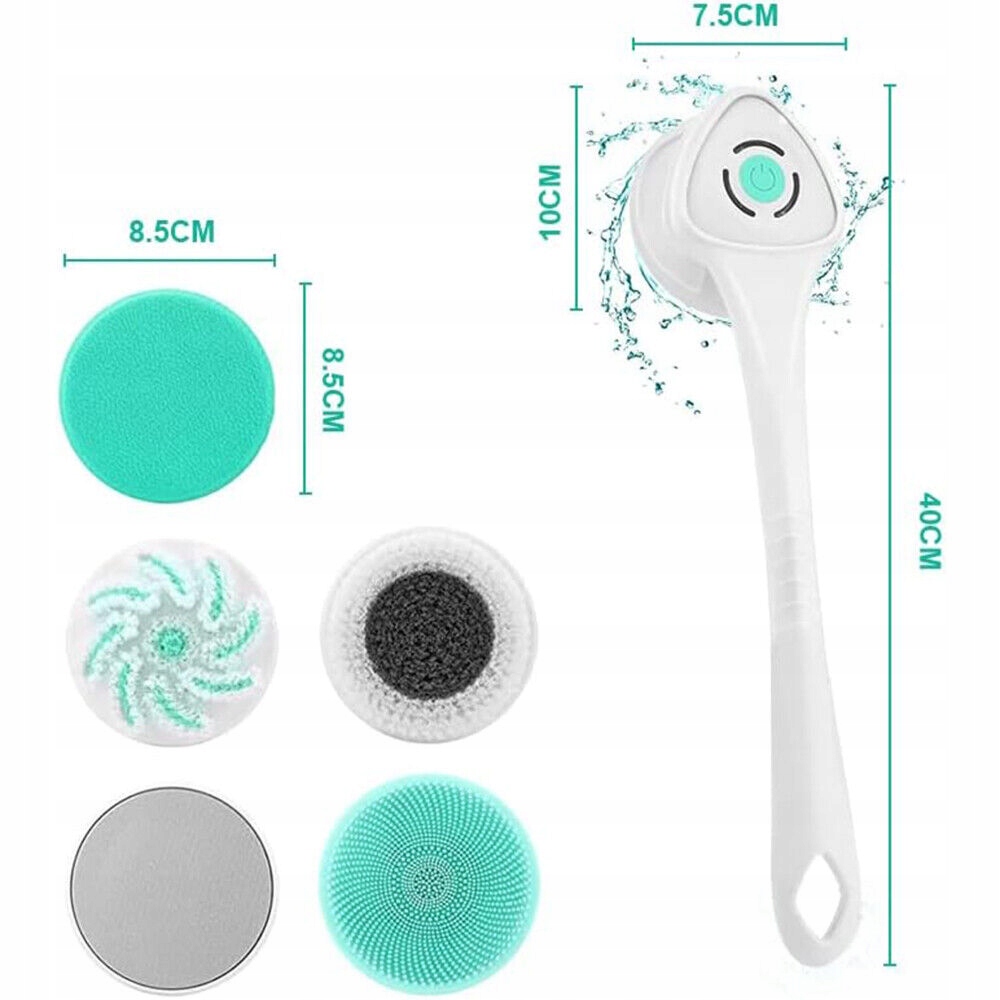 🛁【Электрическая щетка для тела 5 в 1】Электрическая щетка для спины с 5 сменными насадками: насадка для микродермабразии и отшелушивания, насадка для пены, насадка для пены с мягкой щетиной, насадка для пены для ванны, насадка для силиконовой массажной щетки, которая может эффективно отшелушивать тело, масло, пятна и скраб для ног; Его также можно массировать для регенерации уставших и воспаленных мышц.