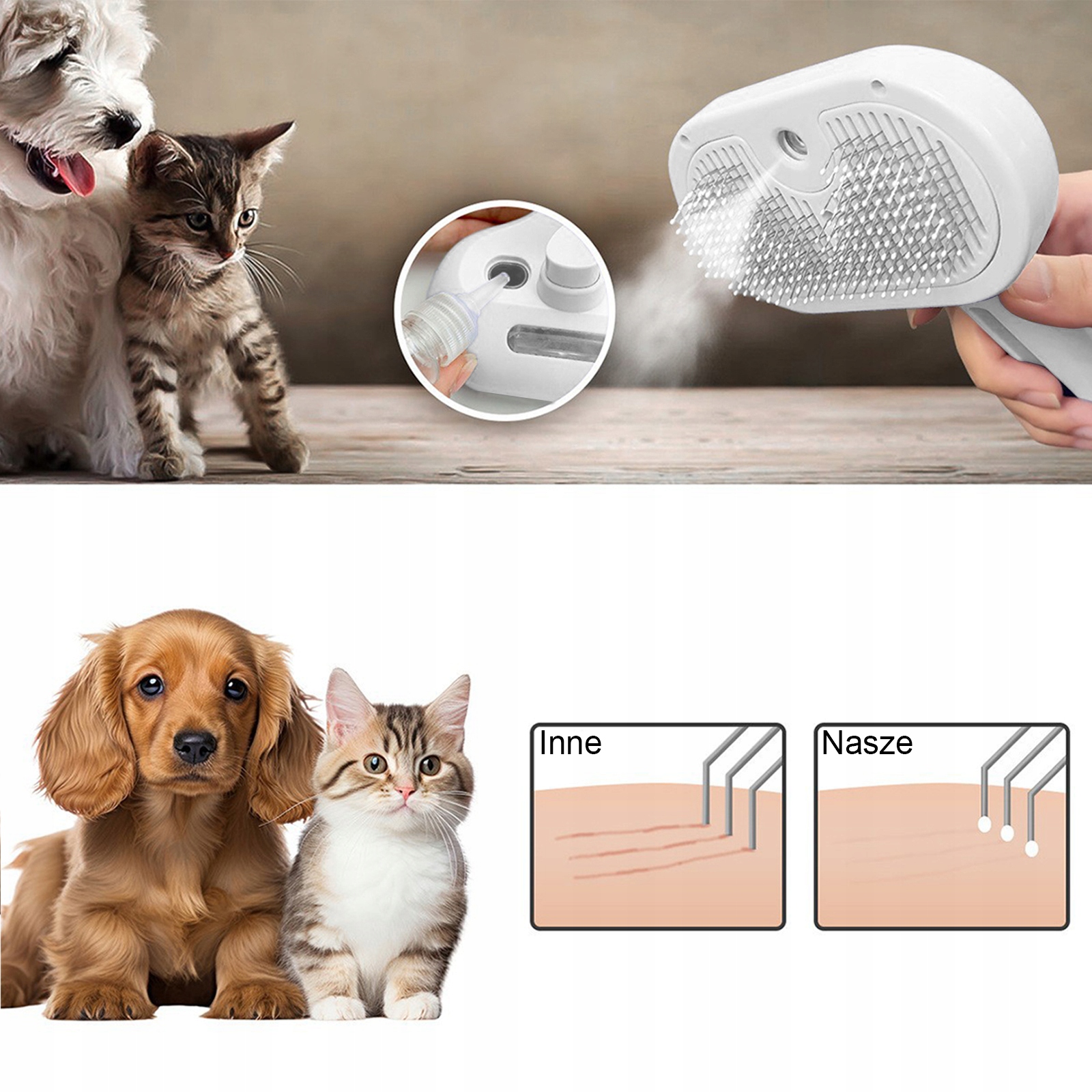 🐈🐕🐾Практическая паровая щетка для кошек: паровая щетка для кошек оснащена паровым нагревательным устройством, которое распыляет водяной туман или питательный спрей во время расчесывания шерсти. Функция распыления равномерно распределяет влагу или увлажняющий крем, помогая распутать колтуны и сделать шерсть мягкой и блестящей. Щетку для кошачьей шерсти можно использовать после купания или в сухой среде, что очень полезно для поддержания шерсти вашей кошки увлажненной и здоровой, подходит для различных нужд ухода.🐱🦠🐶