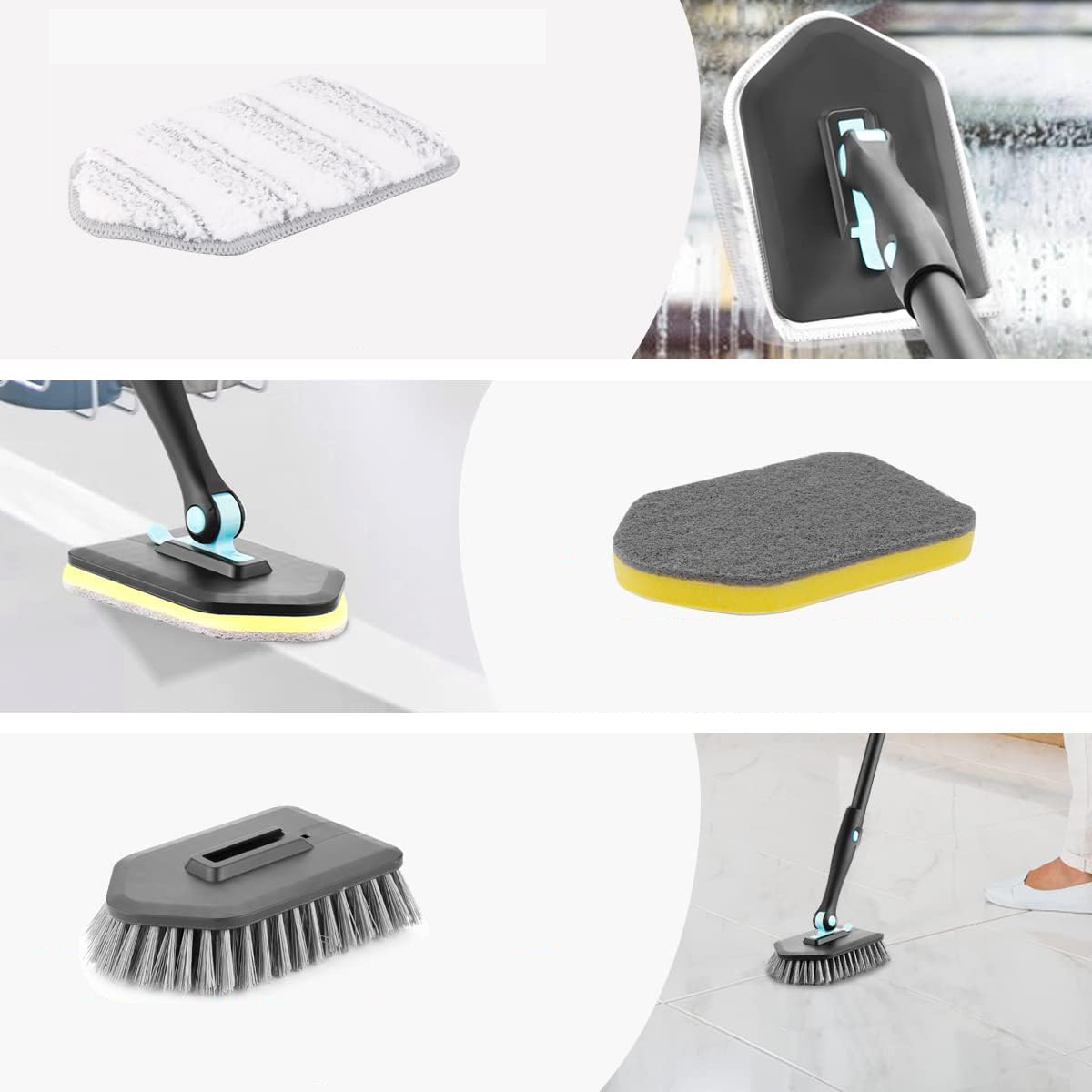 - ✔️ Щетка с жесткой щетиной подходит для очистки стойких загрязнений с напольной плитки, насадку-губку можно использовать для очистки пятен на небольших поверхностях; Подушечка из микрофибры подходит для чистки стекла, стен и других поверхностей.