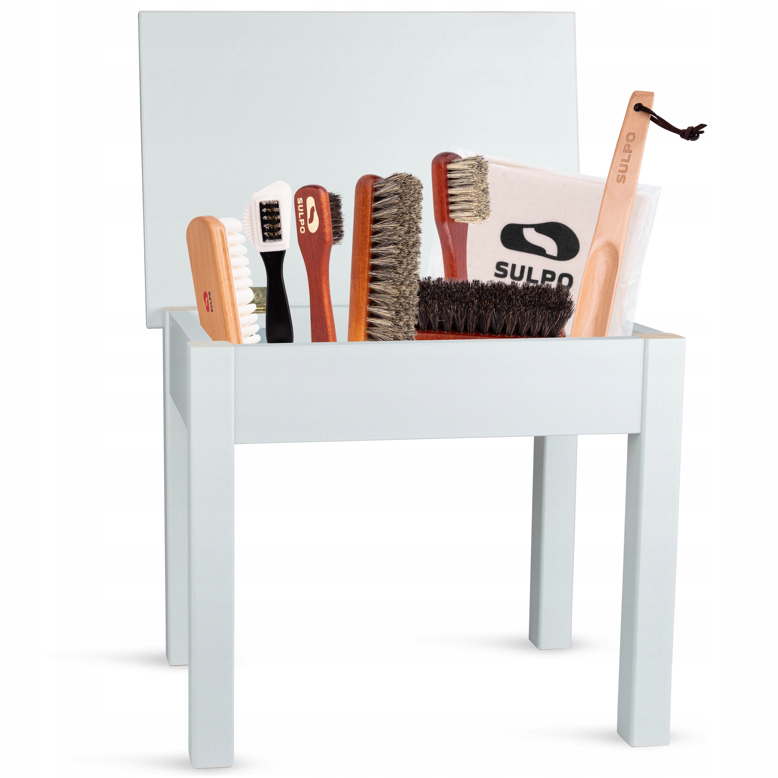 Уникальный комплект для обуви SULPO не только эстетичен, но и функционален. Он может выступать в качестве сиденья, подставки для ног, стола или даже декоративного элемента ВАШЕГО интерьера. С набором кистей SULPO с конским волосом ваша обувь всегда будет выглядеть b>новой. Наслаждайтесь первозданным видом вашей обуви долгие годы. Качество и элегантность в одном комплекте.