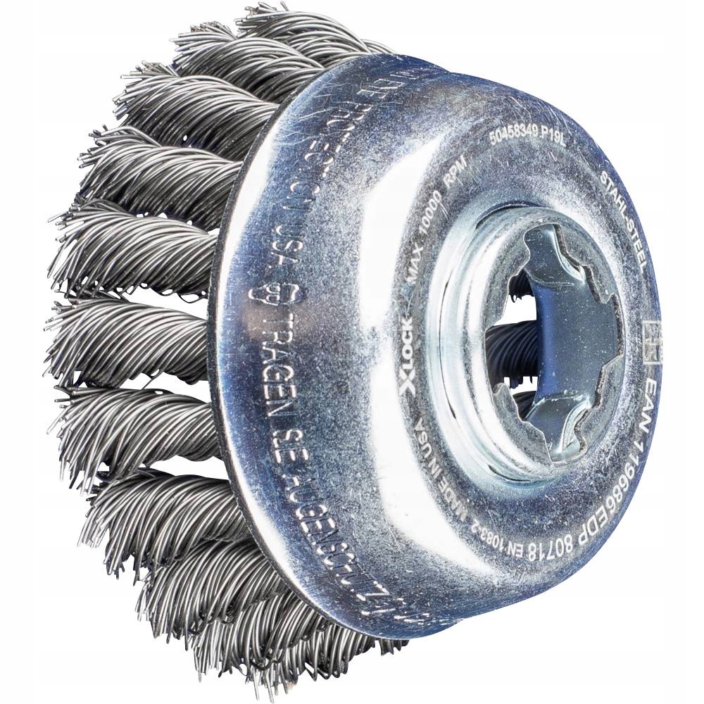 Чашечные щетки, связанные, TBG, Агрессивная щетка. Идеально подходит для тяжелых работ по чистке, таких как удаление заусенцев, очистка и удаление ржавчины с больших поверхностей. Преимущества: Агрессивный эффект чистки благодаря высокой жесткости проволочной оплетки. С держателем X-LOCK для быстрой и легкой смены инструмента. Рекомендации по использованию: Для достижения оптимальных результатов используйте на мощных угловых шлифовальных машинах.