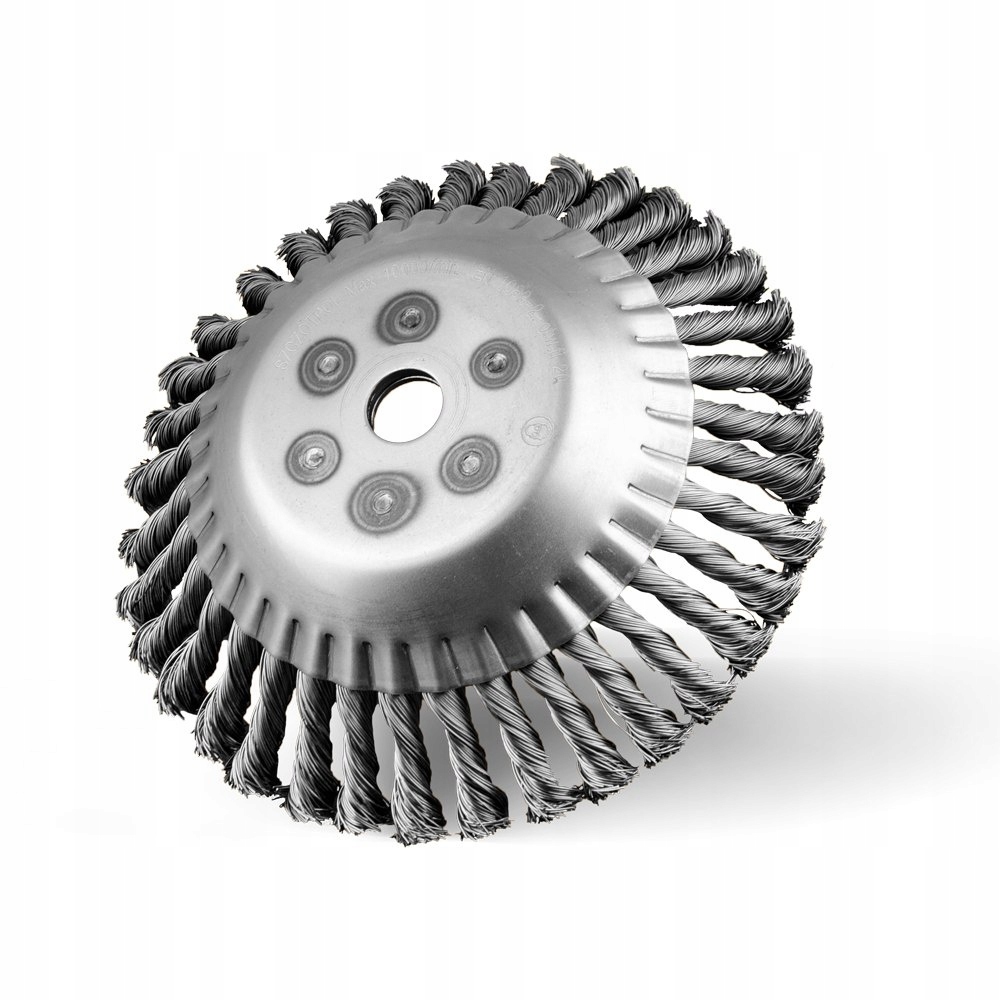 Щётка с плетеной проволокой предназначена для уборки сильно заросших мест. Плетеные провода также пригодятся для очистки труднодоступных зазоров и пазов. Они легко удалят комки древесных сорняков.