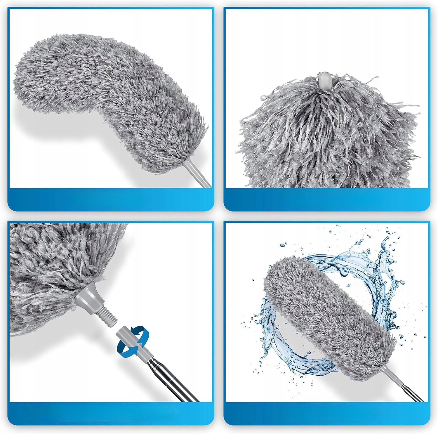 Длинная телескопическая ручка с регулируемой длиной от 80 до 280 см и гибкой щеткой из микрофибры позволяют без усилий добраться до каждого закоулка и труднодоступных мест.