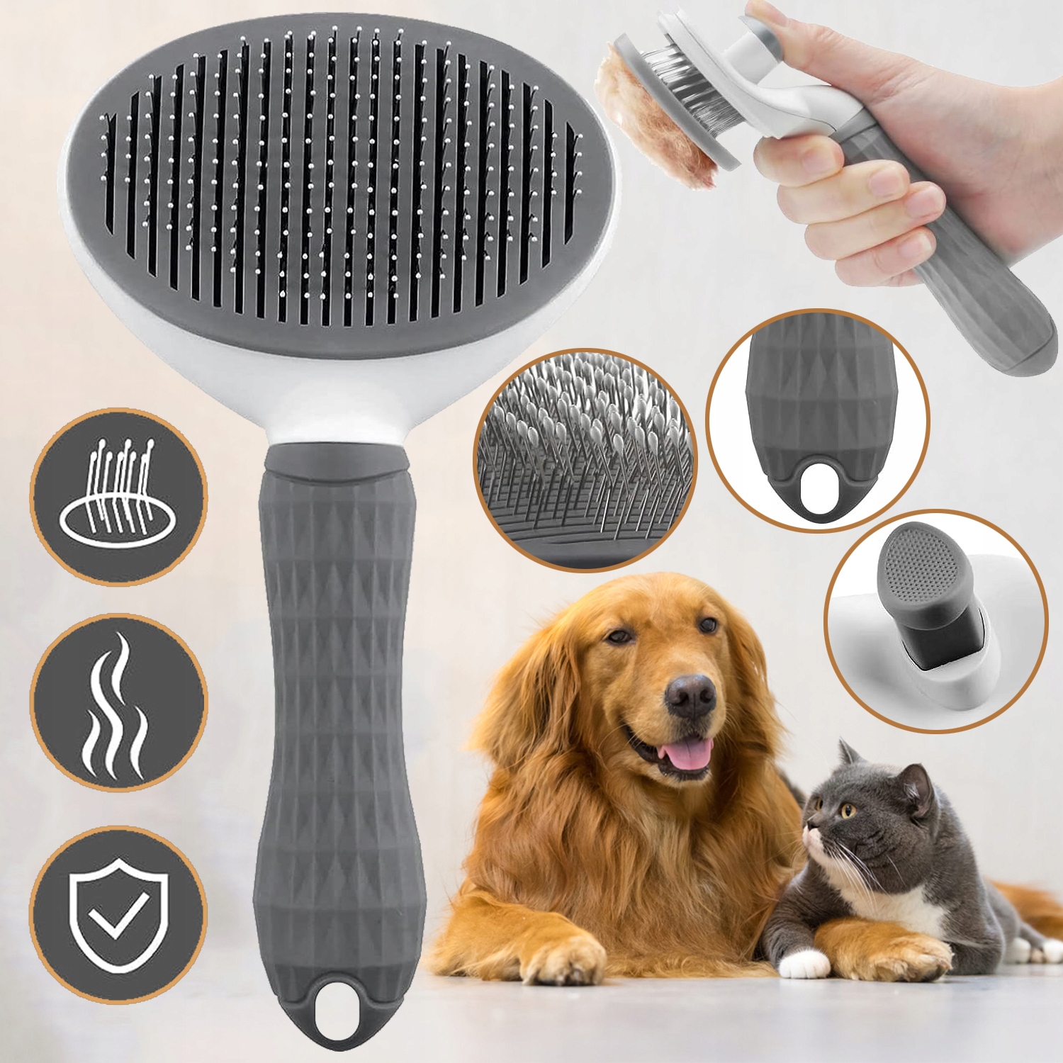 Решает проблему выпадения шерсти у домашних животных; массаж для снятия зуда, чистые отмершие и плавающие волосы, прочные зубцы расчески, которые нелегко сломать, разумное расстояние между зубами, удобный уход