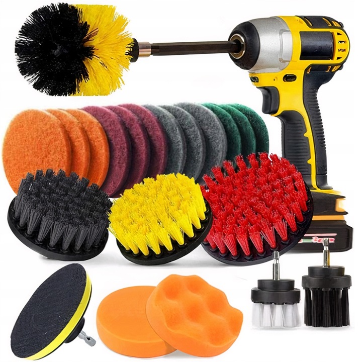 - НАБОР БОЛЬШОЙ XXL – весь набор насчитывает целых 22 элемента для чистки, чистки и полировки различных типов покрытий. Есть щетки для чистки, губки для полировки и абразивные нетканые материалы. Таким образом, вы можете подобрать подходящий размер и тип чистящего элемента в соответствии с вашими текущими потребностями, что значительно расширяет возможности использования набора