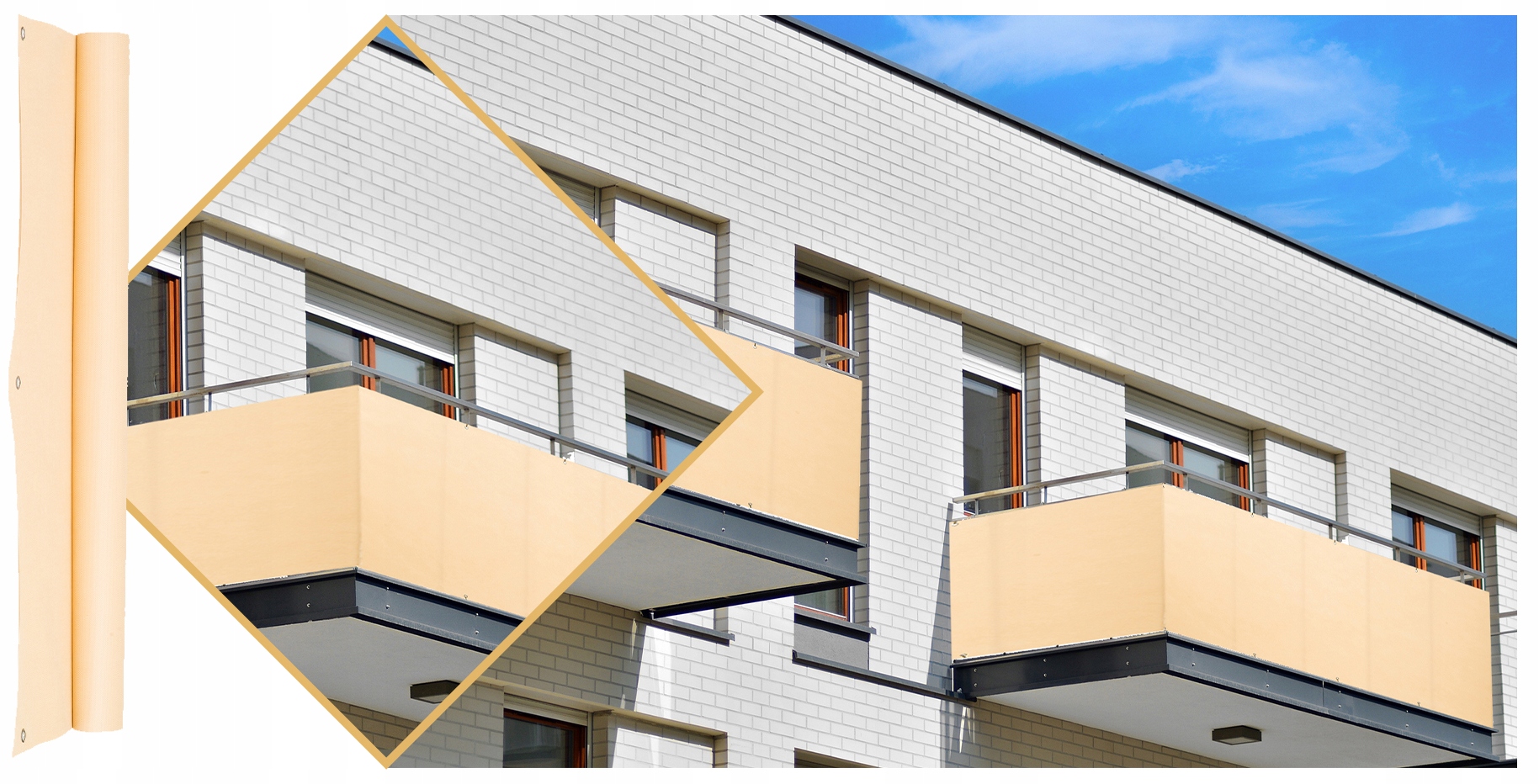 ➡️ Лучший способ установки балконного покрытия — вплетение его между перилами. Это предотвращает создание эффекта «паруса».