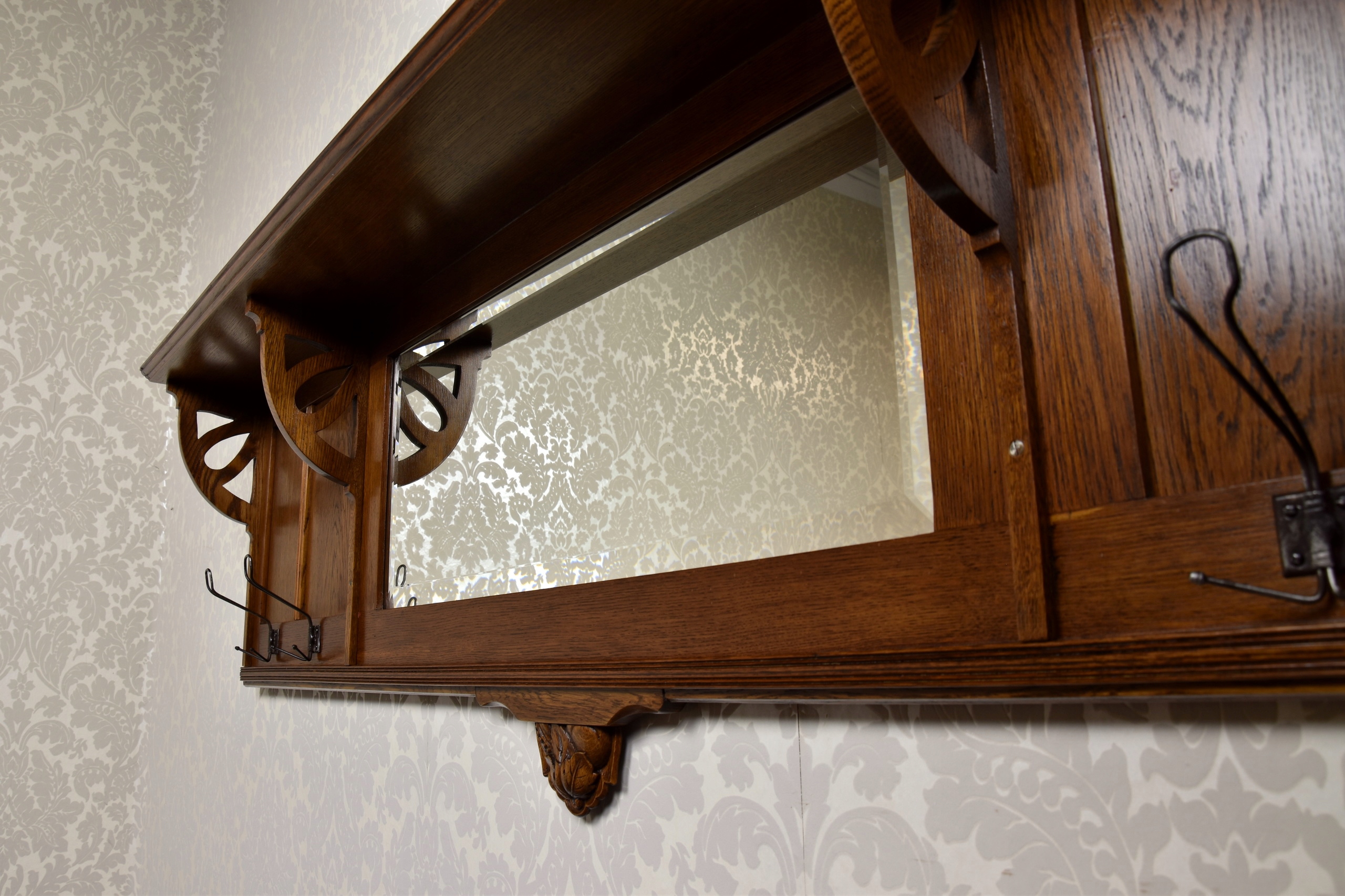 Шкаф прошел тщательный профессиональный ремонт и находится в идеальном состоянии, как технически, так и визуально. Дерево в очень хорошем состоянии. Конструкция очень жесткая и устойчивая. Никаких неприятных запахов. В комплект входят четыре стальные вешалки. На оригинальном полированном зеркале видны незначительные царапины и изменения цвета. Однако это не мешает его использованию, а лишь подчеркивает его исторический характер.