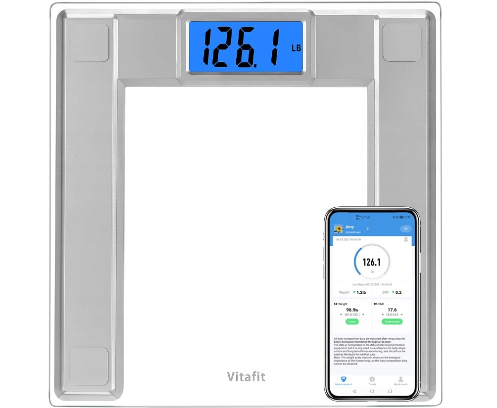 Цифровая шкала ванной комнаты Vitafit с очень большой способностью 250 кг до массы тела и ИМТ с использованием интеллектуального применения, профессионального веса с 2001 года, 8 мм и пошагового измельченного стекла, очень большого h1>