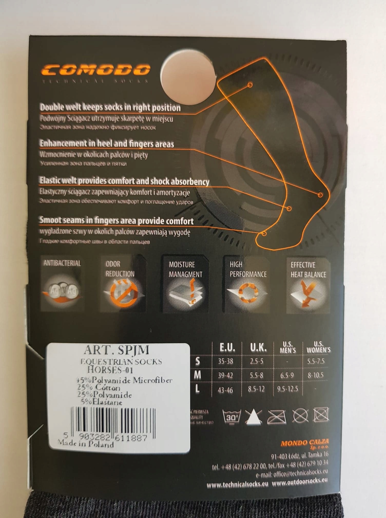 "Mondo-calza" Sp. з о.о. работает на рынке с 1996 года. Это польская компания с многолетним опытом работы в трикотажной отрасли, которая на протяжении многих лет работает над обеспечением безупречной репутации компании и ее постоянного развития. Компания постоянно старается улучшить свое предложение и качество своей продукции. Основная продукция – спортивные носки и технические носки, предназначенные для занятий различными видами спорта. Это носки с термоактивными и теплоизоляционными свойствами. В настоящее время современный машинный парк, которым управляет команда профессиональных сотрудников, обеспечивает производство от 100 000 до 200 000 пар носков в месяц, в зависимости от типа носков и используемого сырья. В последние годы бренд Comodo также уделяет большое внимание технологиям устойчивого развития и защите окружающей среды.