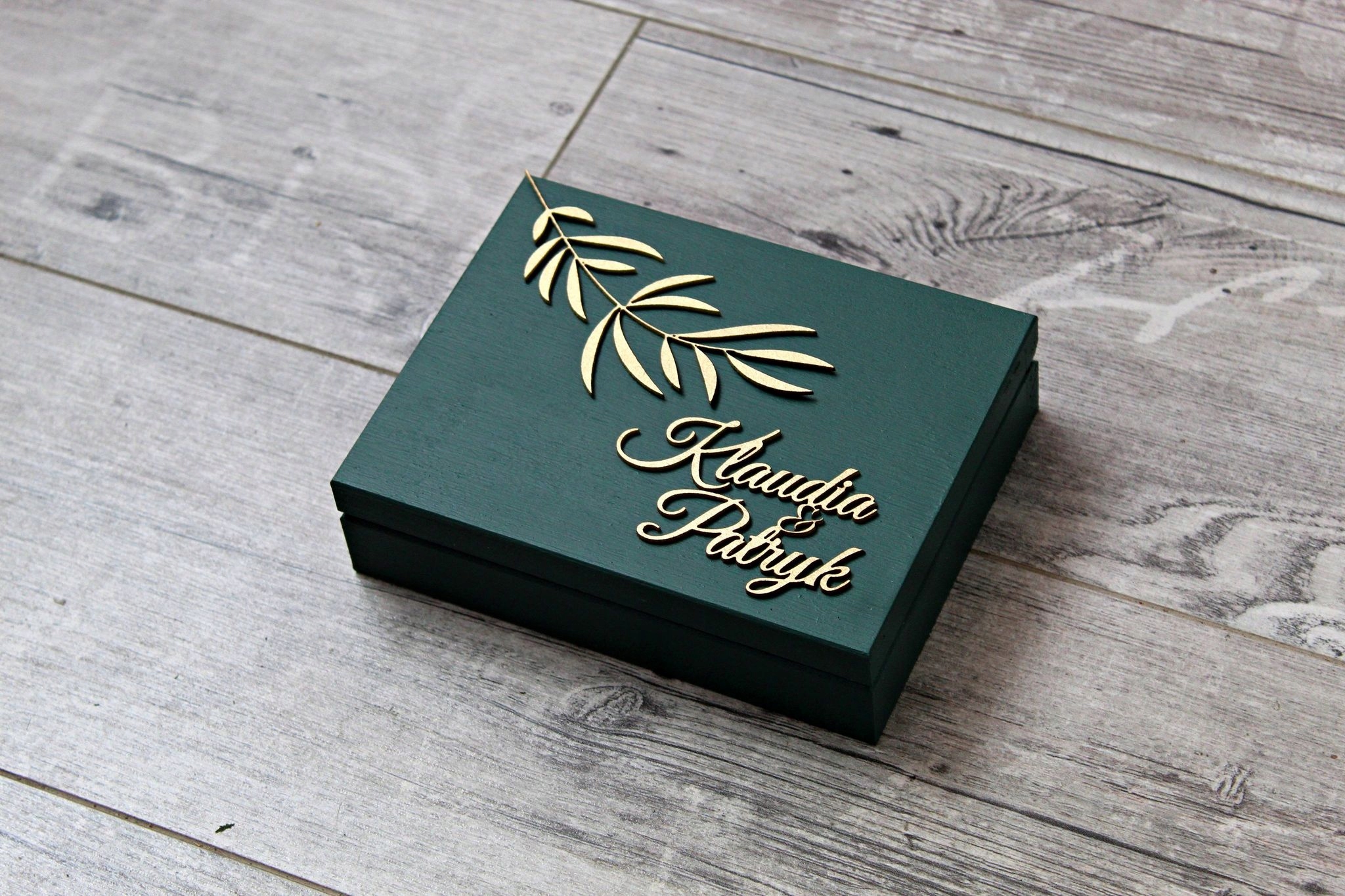 Коробка для обручальных колец, расписанная вручную в бутылочно-зеленый цвет.