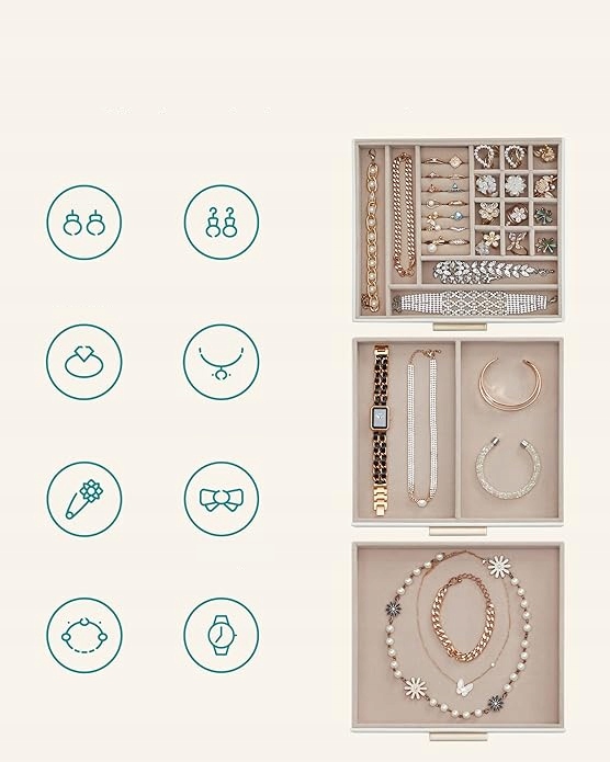 Создайте элегантное и функциональное место для вашей коллекции ювелирных изделий! Просто восхищайтесь коллекцией, но также защищает ее от пыли. У вас есть много вариантов хранения с разными размерами и три уровня - от нежных серьгов до эффективных колец или ожерелий. аксессуары