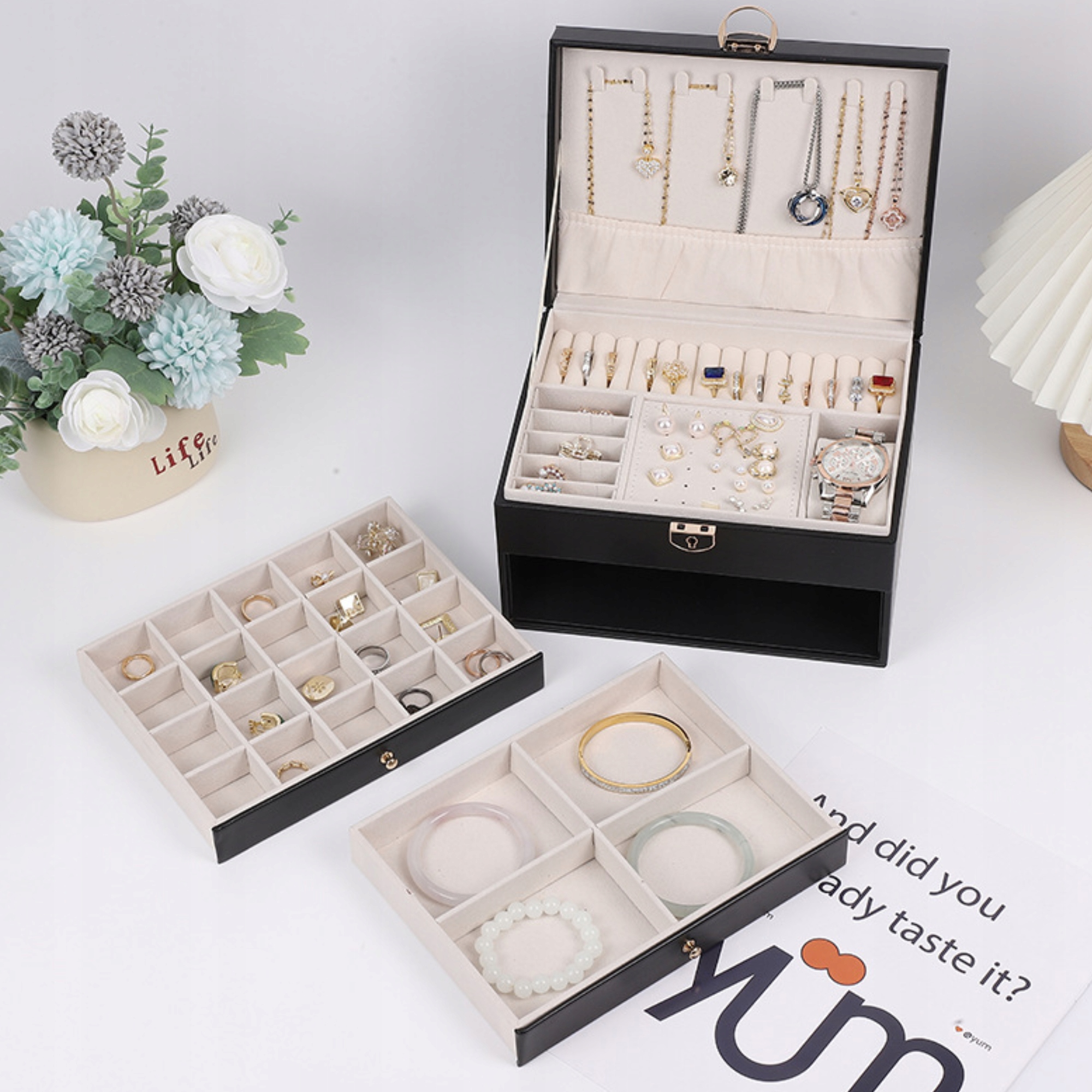 • Трехуровневая конструкция: Каждый уровень свободно раскладывается и закрывается, что облегчает как хранение, так и быстрый доступ к украшениям.