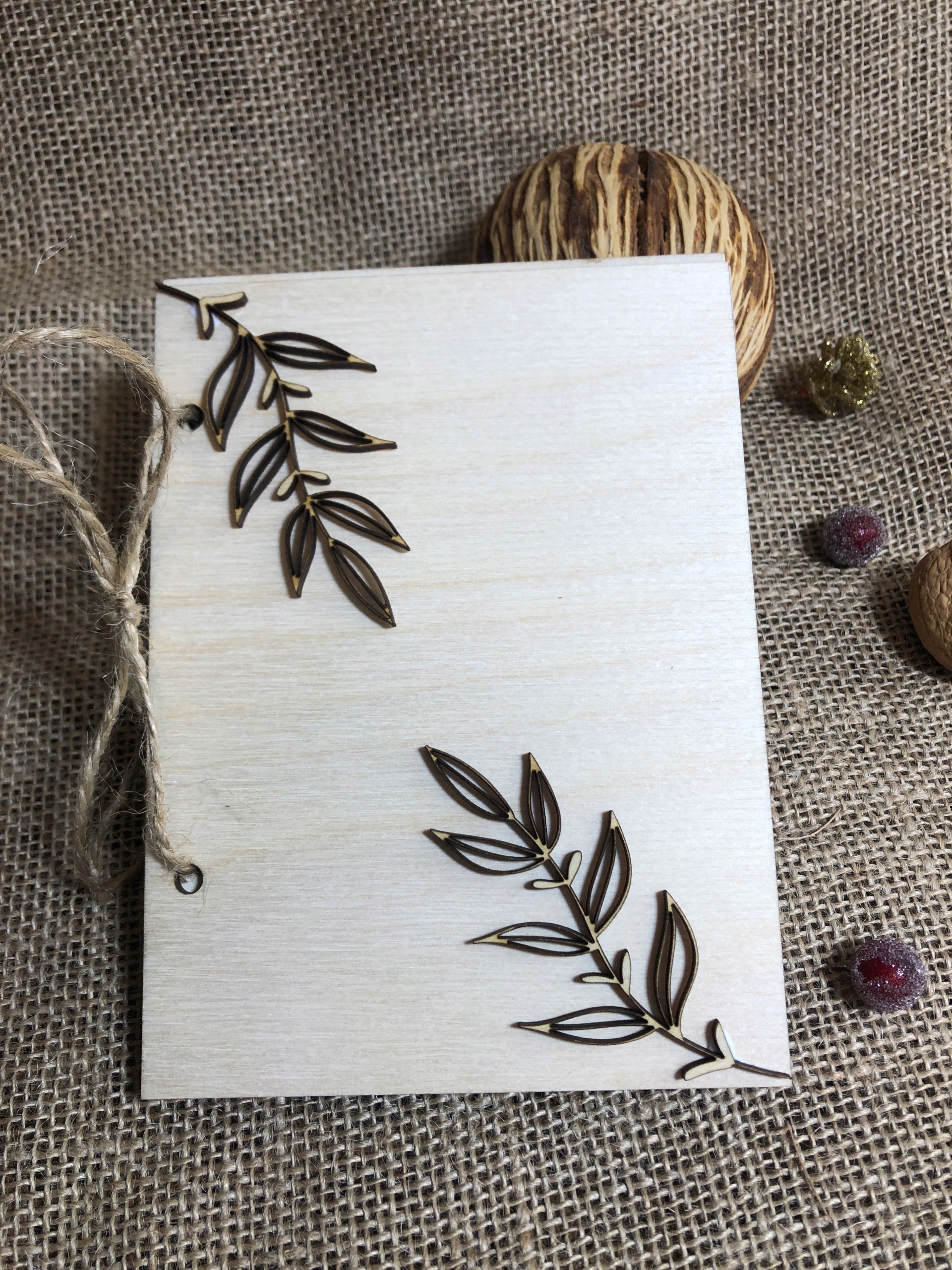 Внешняя сторона открытки украшена изготовленными нами ветками, что придает ей элегантности. Дополнительный элемент — перевязка страниц джутовой веревкой.