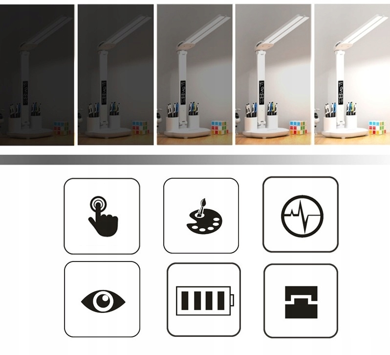 - РЕГУЛИРОВКА ЦВЕТОВОЙ ТЕМПЕРАТУРЫ И ИНТЕНСИВНОСТИ СВЕТА – современный светодиодный светильник с дисплеем имеет возможность установки трех уровней цветовой температуры: теплая 2800 – 3200 , холодная 5000 - 5500 и нейтральная (теплая + холодная) 4000 - 4500. Дополнительно настольная лампа имеет 5-ступенчатую регулировку силы света , которым легко пользоваться благодаря сенсорным кнопкам управления.