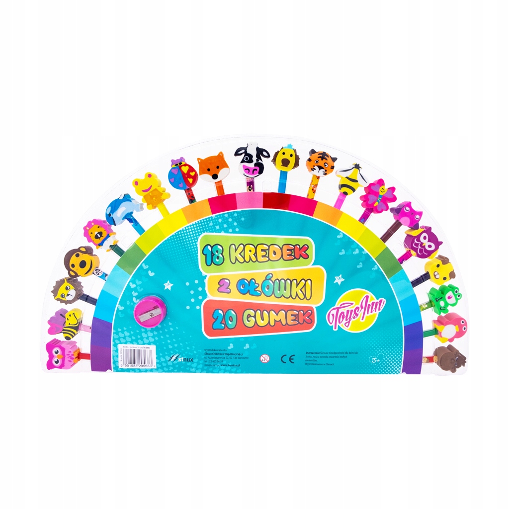 В комплект входит 18 мелков и 2 карандаша, а также 20 цветных ластиков и точилка.