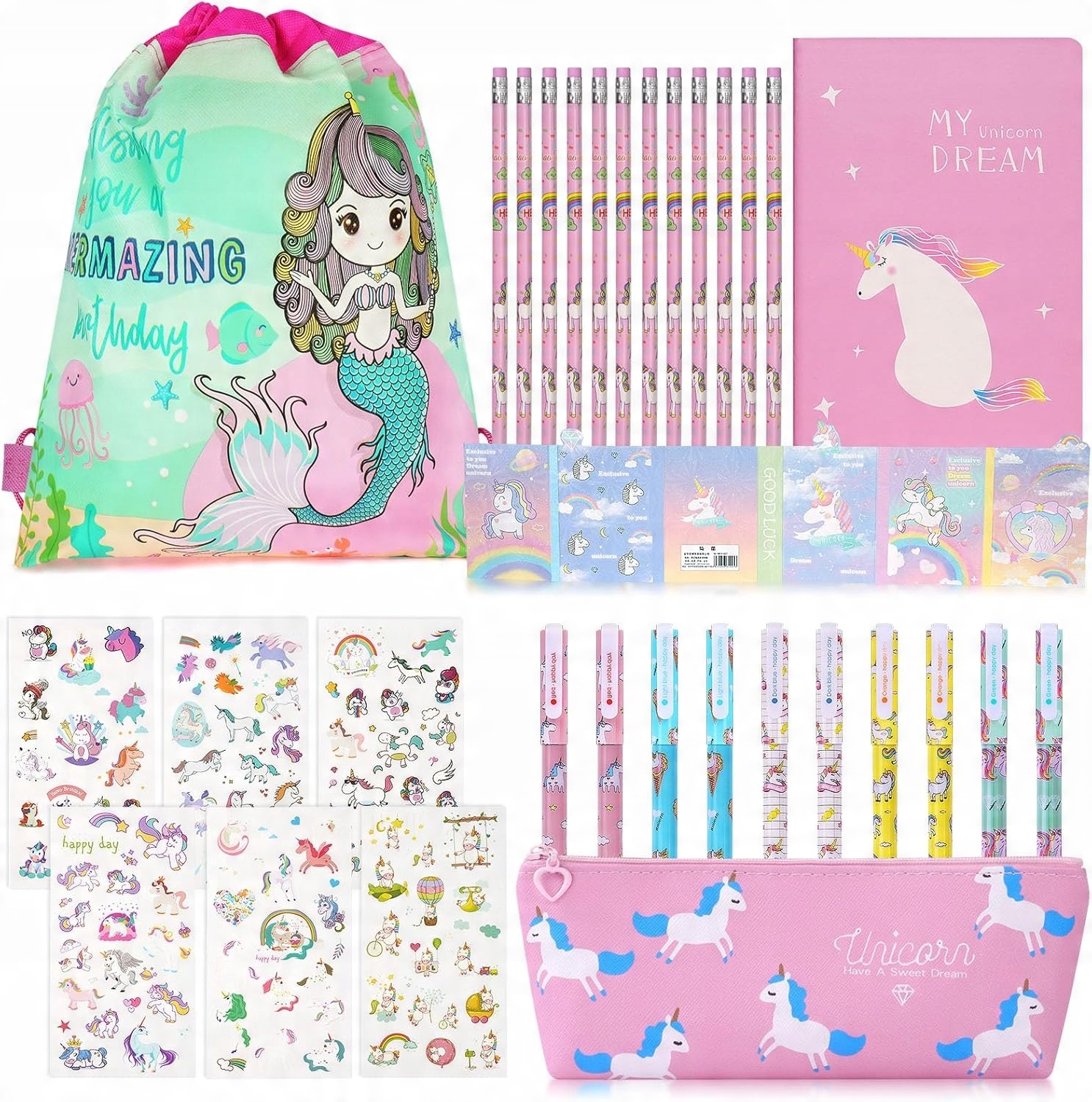 - Набор наклеек: очаровательные наклейки с различными дизайнами, которые можно использовать для украшения ноутбуков, книг или в качестве призов для хороших академических результатов. Ручки, эластики и точилка.