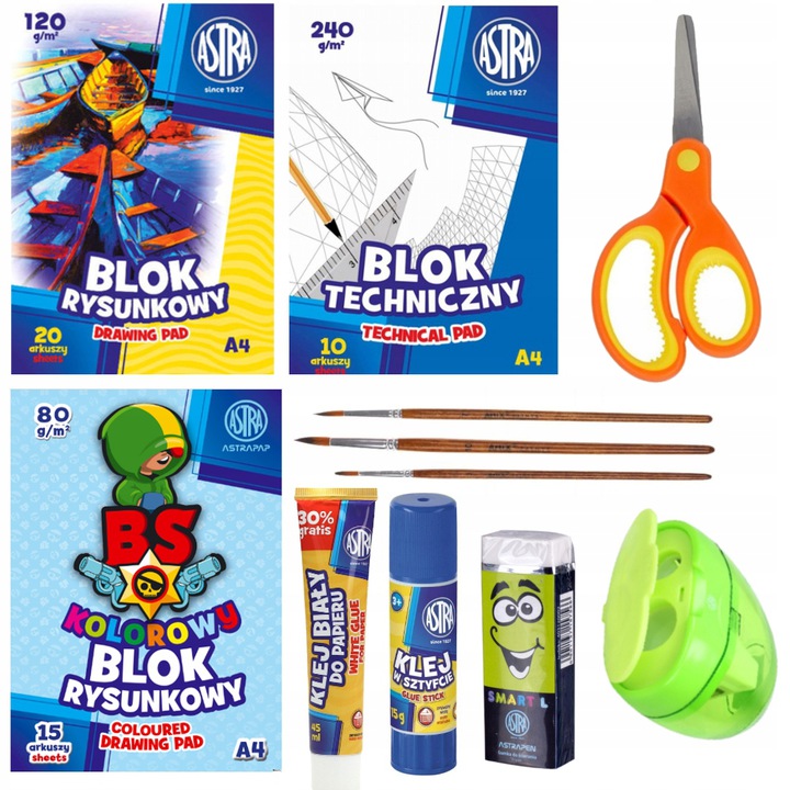 Наша уникальная школьная тетрадь Astra представляет собой полный набор для школы. Он содержит до 29ключевых элементов. От цветных красок и мелков до практичных ластиков, клея и блоков.