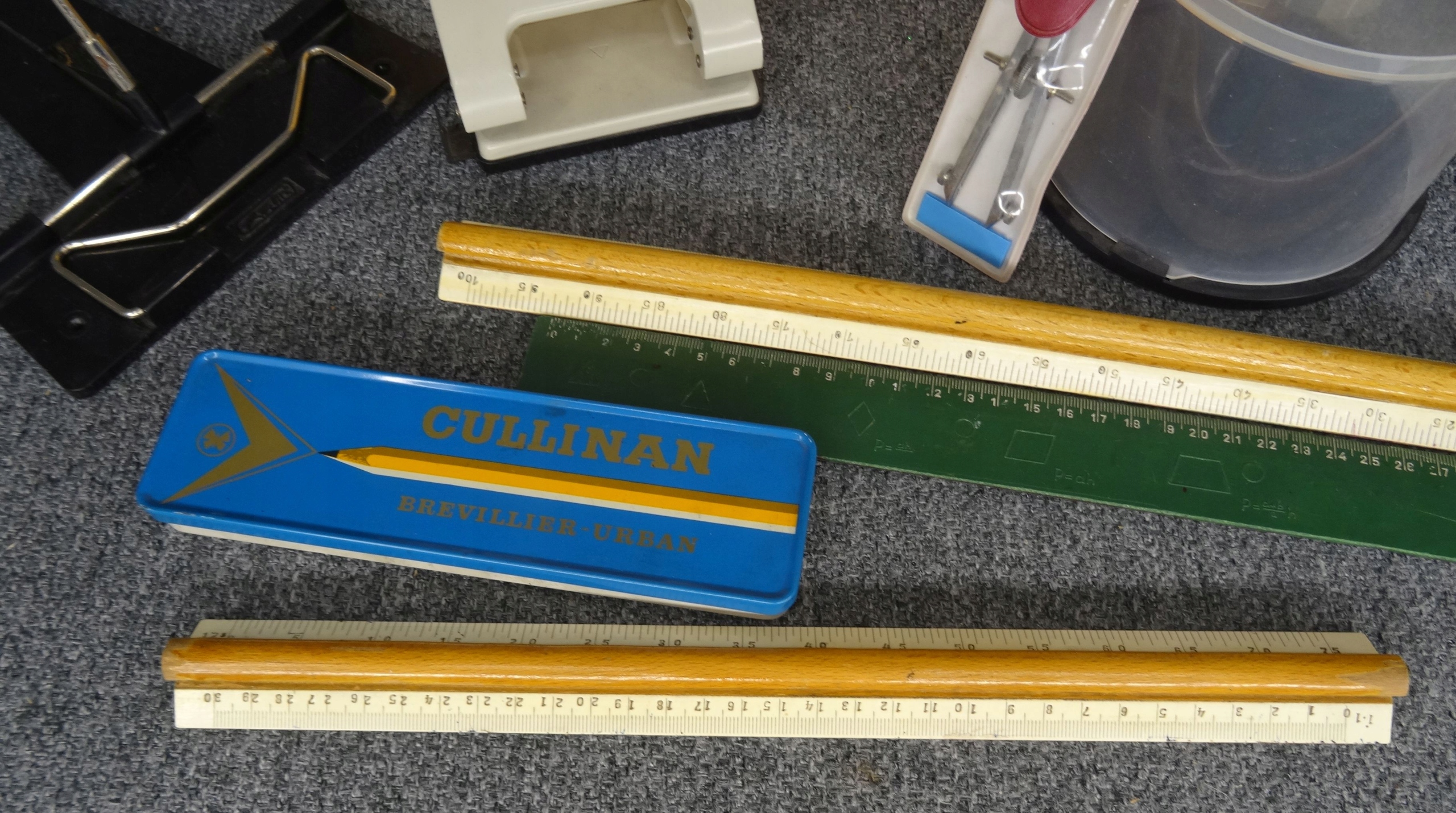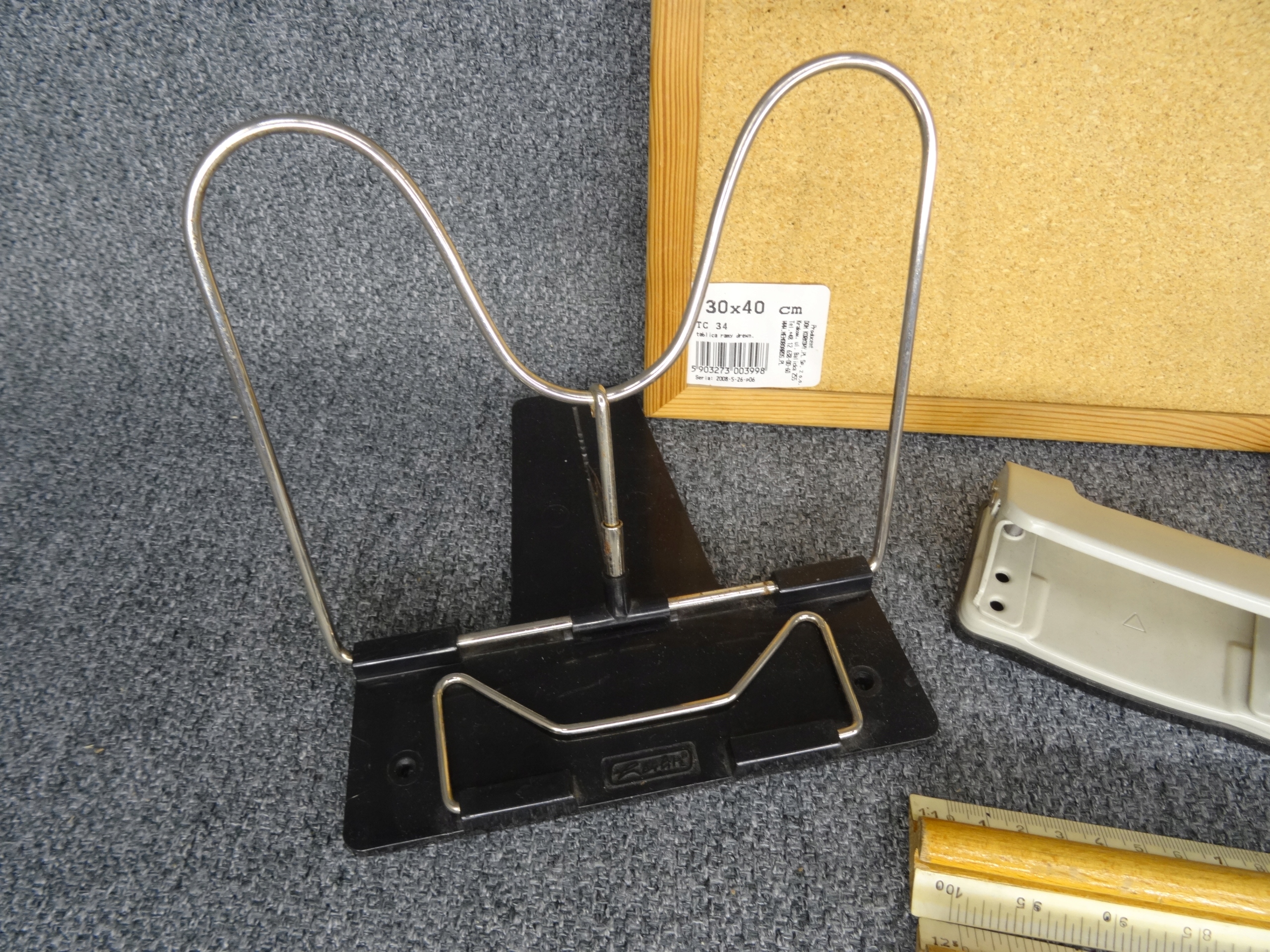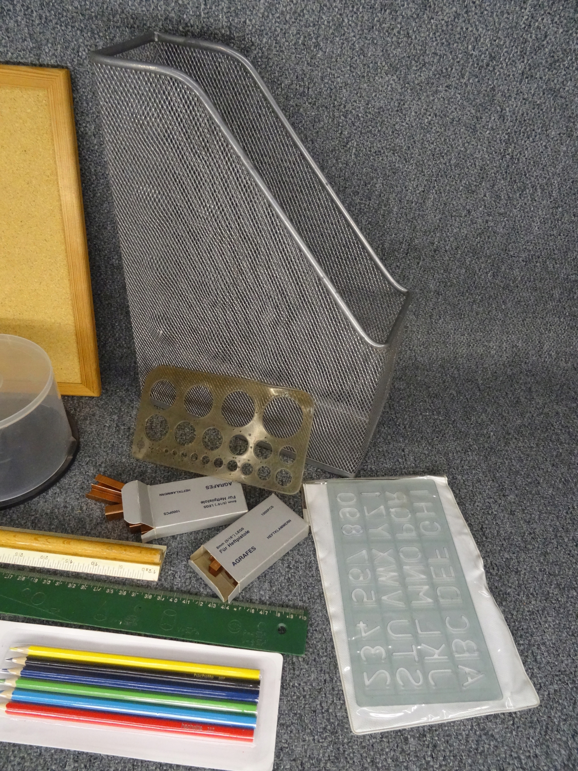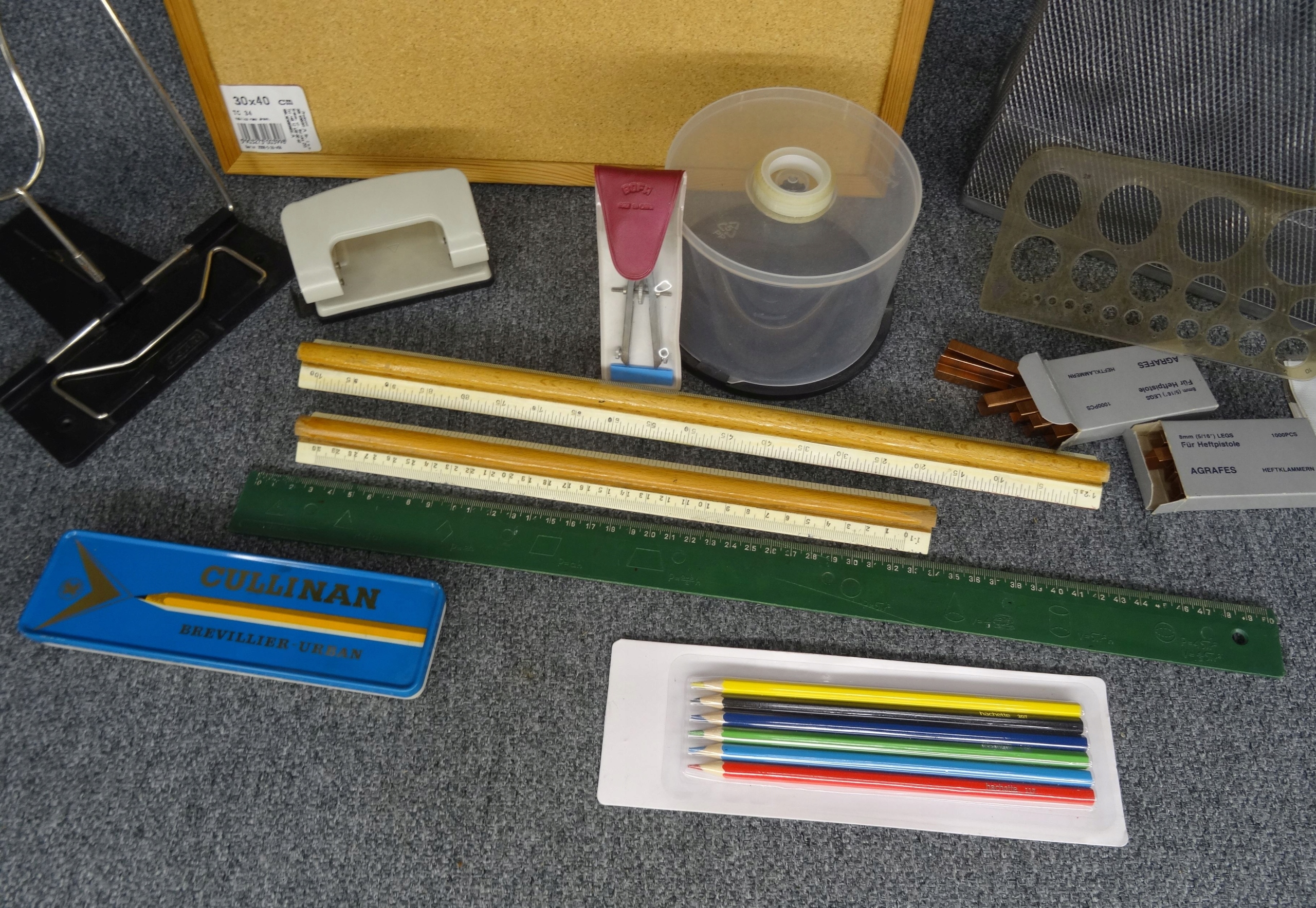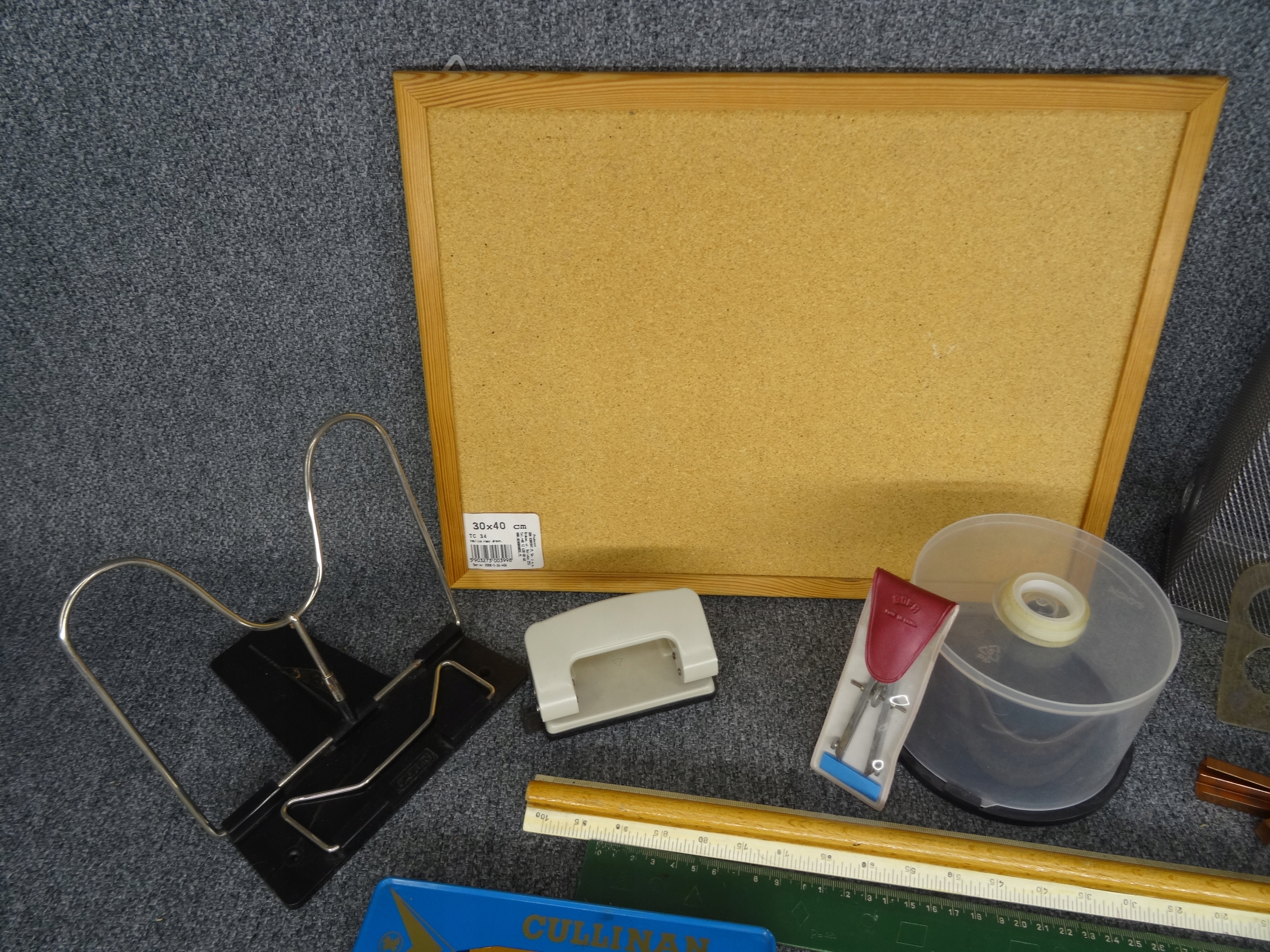 Школьный набор: пробковая доска 30 х 40 см, линейки, циркуль, мелки, шаблоны, органайзер для DVD-дисков, металлический органайзер для папок, две коробки со скобами, дырокол волнистый по краю. Состояние как на фотографиях.