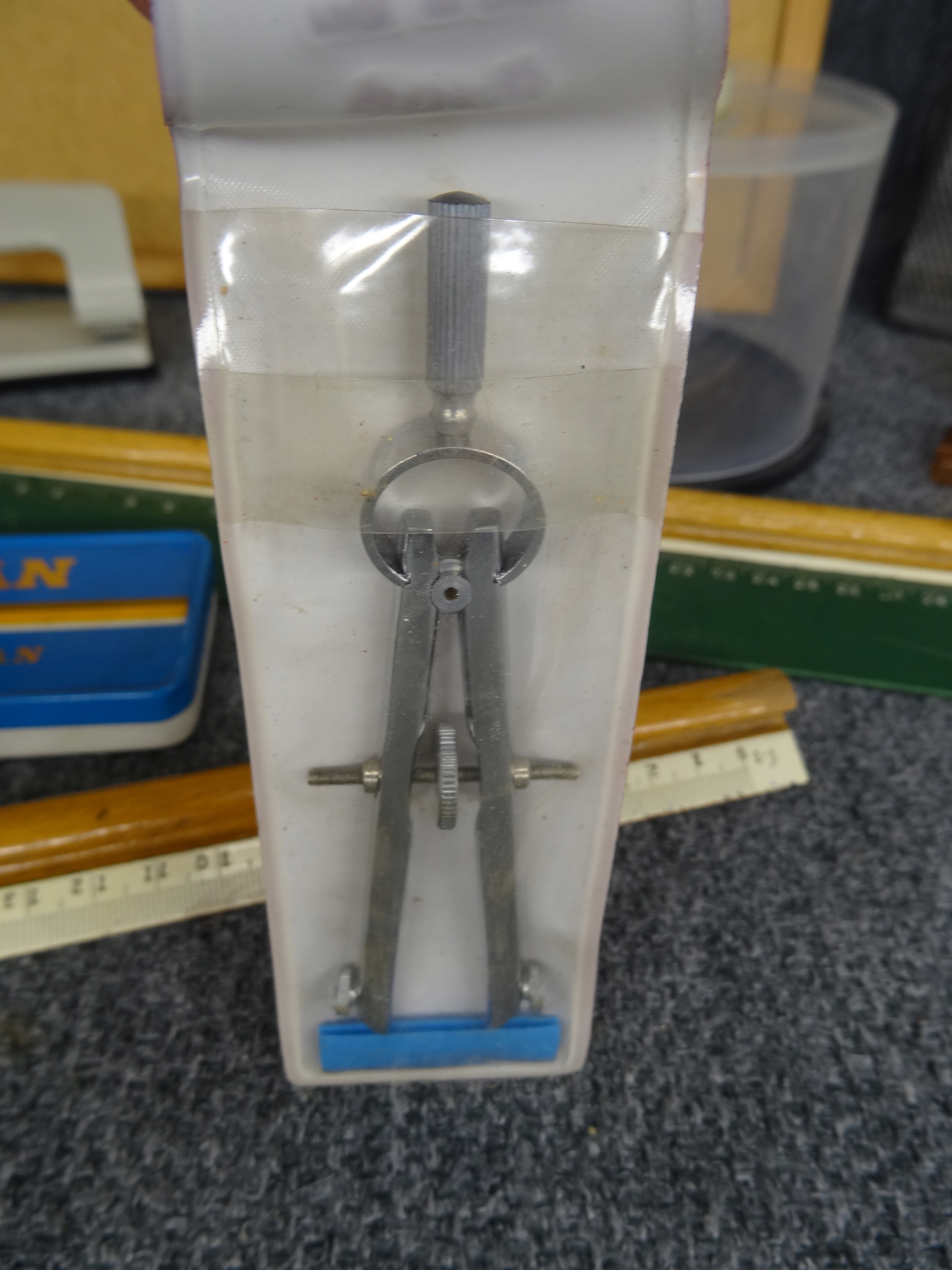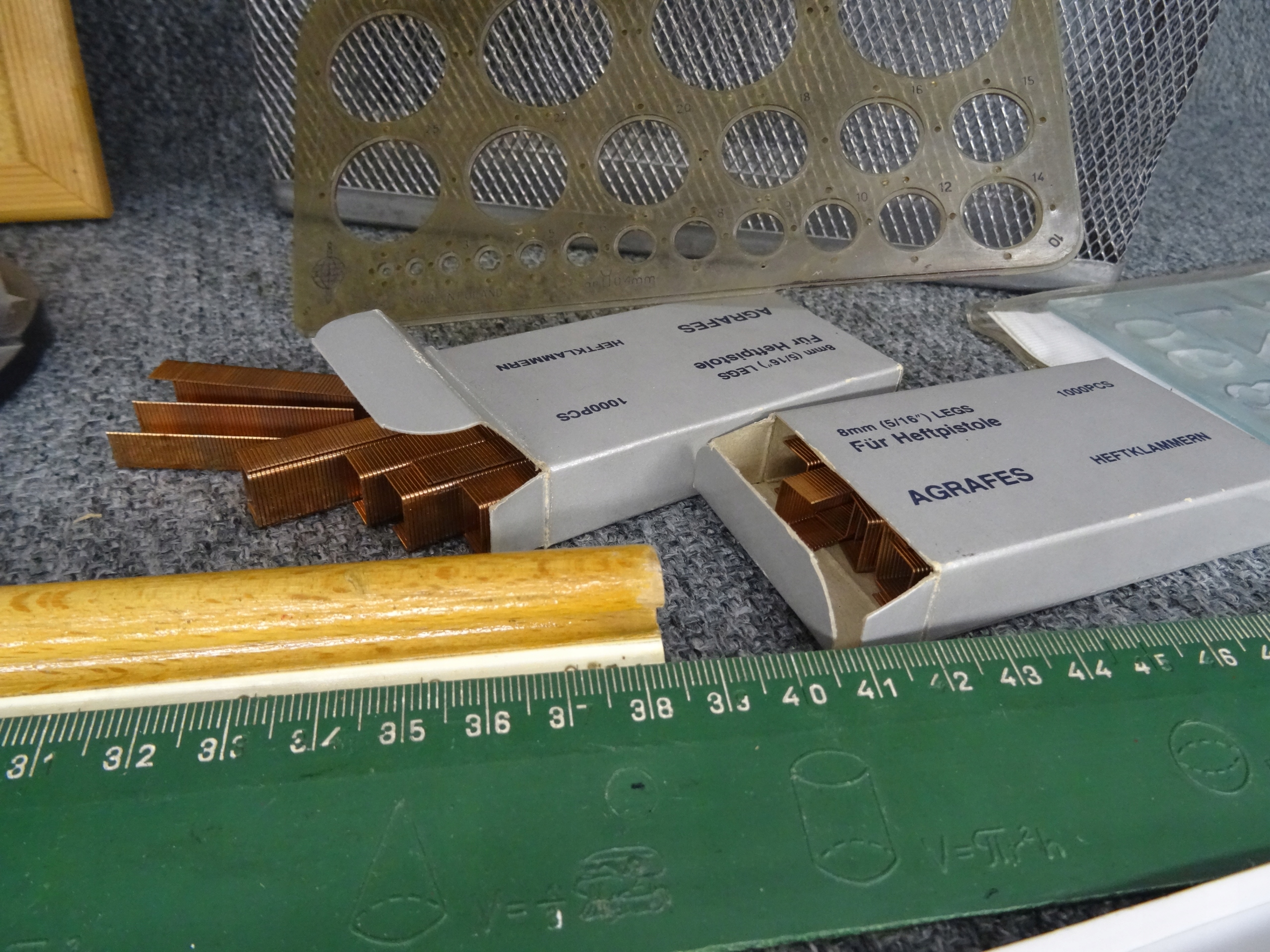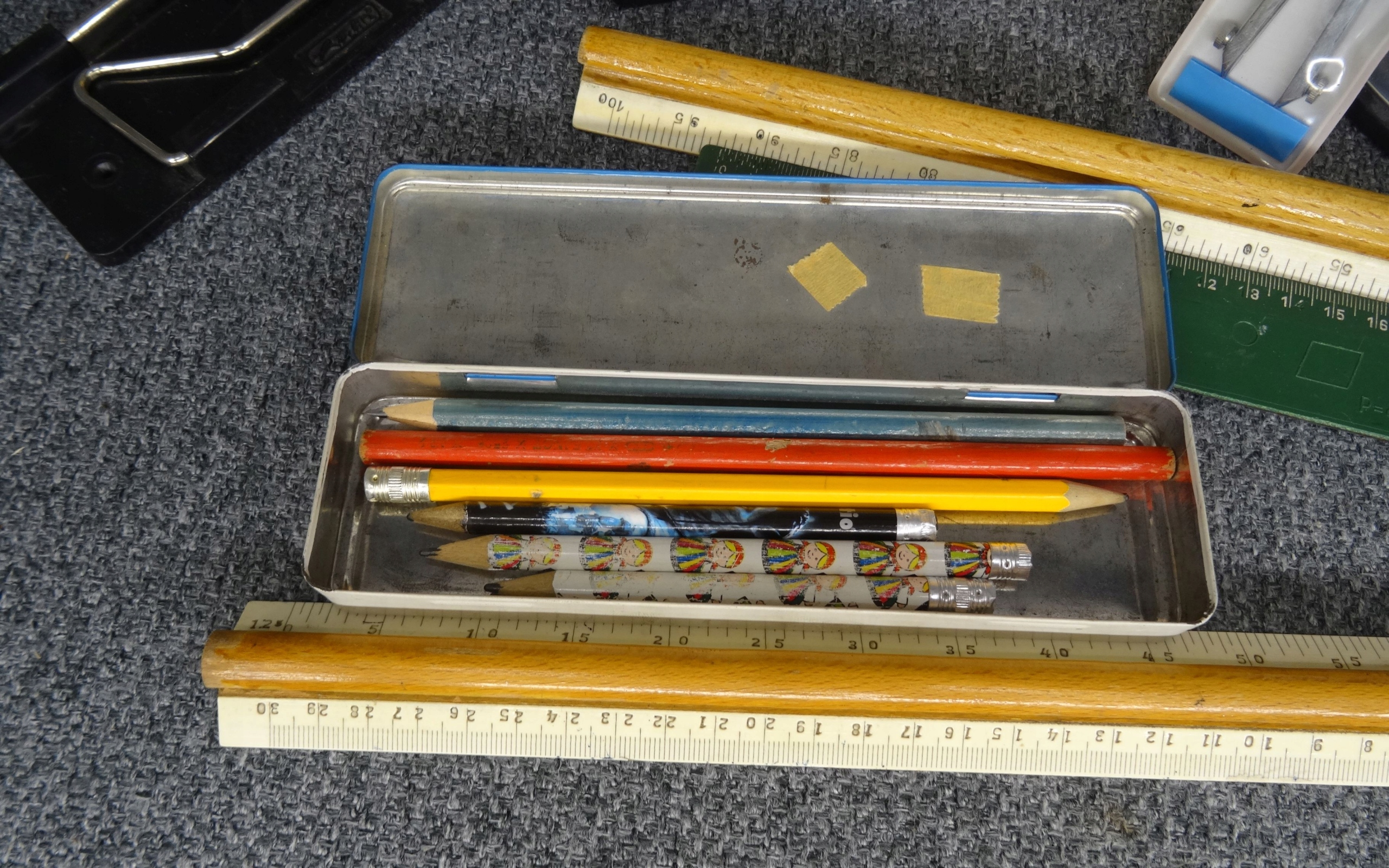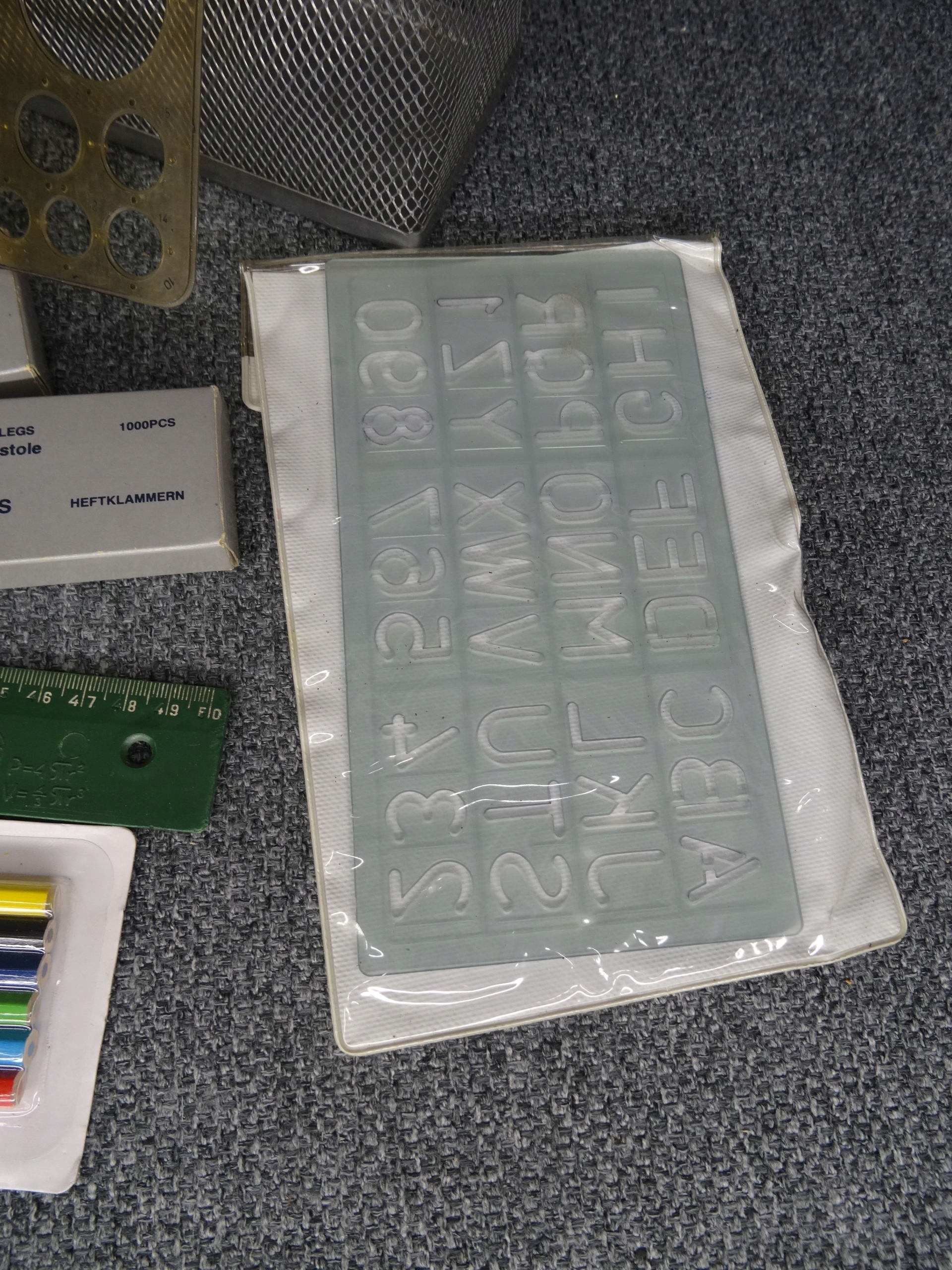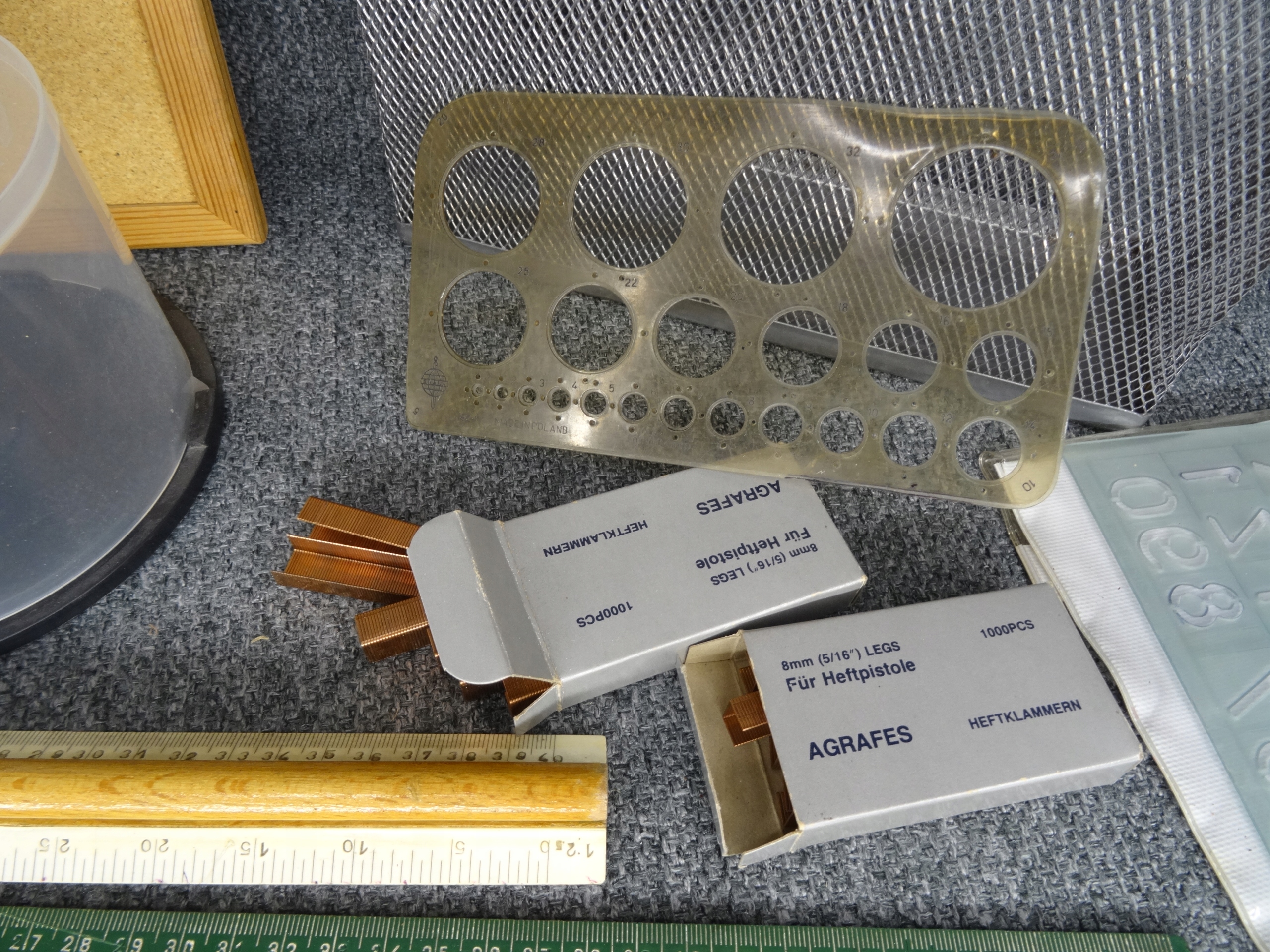 Школьный набор: пробковая доска 30 х 40 см, линейки, циркуль, мелки, шаблоны, органайзер для DVD-дисков, металлический органайзер для папок, две коробки со скобами, дырокол волнистый по краю. Состояние как на фотографиях.