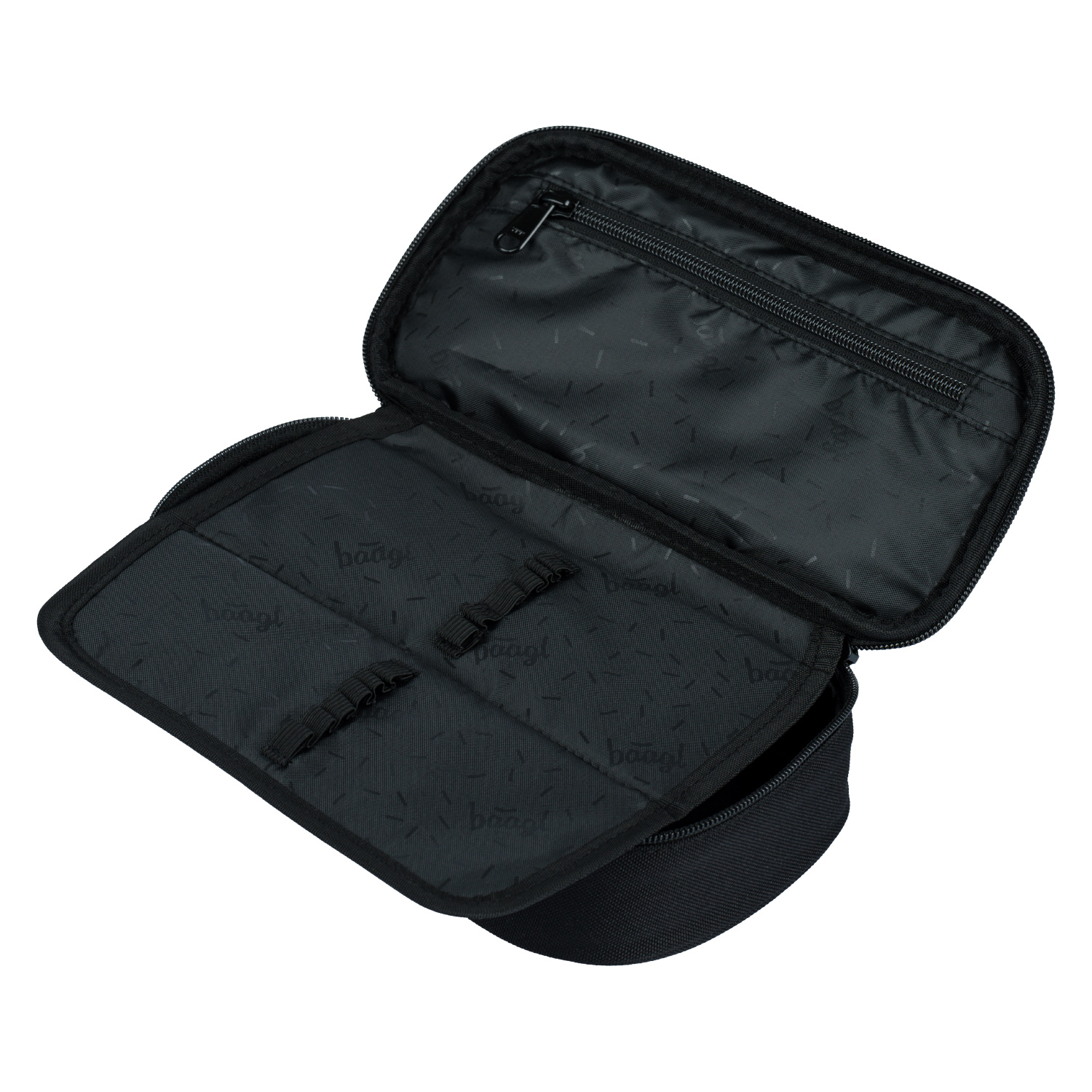 <р> - Внутренний карман на молнии и карман для расписания. <р> - Чемодан изготовлен из переработанного материала, все молнии YKK. <р> - Нет вставки.Вместительный пенал с логотипом BAAGL. Пенал из переработанного материала имеет основное отделение и карман с клапаном с перегородкой и резинками для карандашей и других письменных принадлежностей.