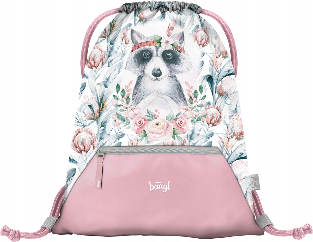 Спортивная сумка с цветочным мотивом и изображением енота, розовых оттенков, с практичным передним карманом.