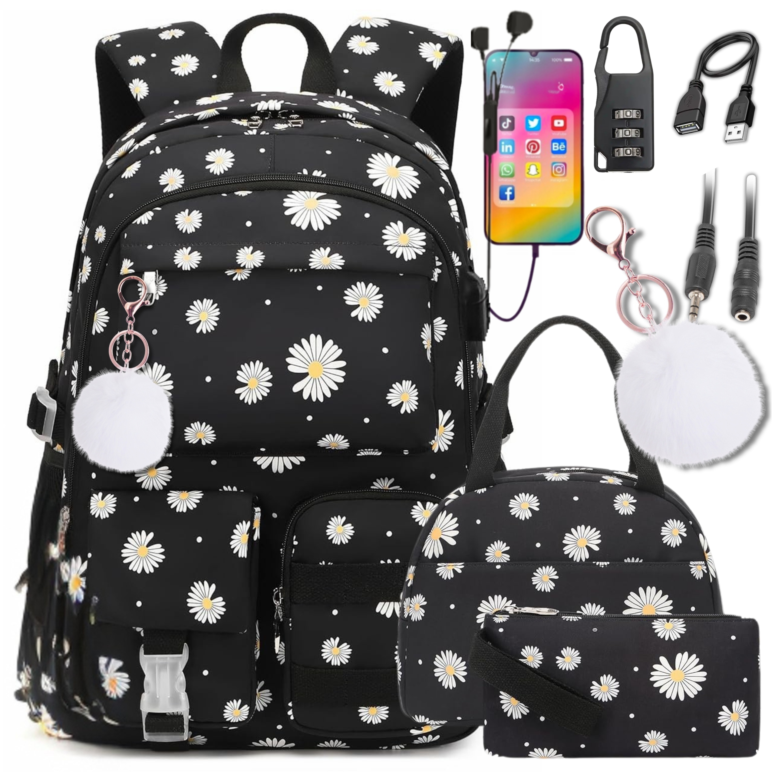 ✅ 🌸ШКОЛЬНЫЙ РЮКЗАК + СУМКА-КАРАНДАШ + НАВЕСНОЙ ЗАМОК + USB-КАБЕЛЬ + ДЖЕК-КАБЕЛЬ + БРЕЛОК С ПОМПОНОМ + ТЕРМОЗАВТРАК СУМКА