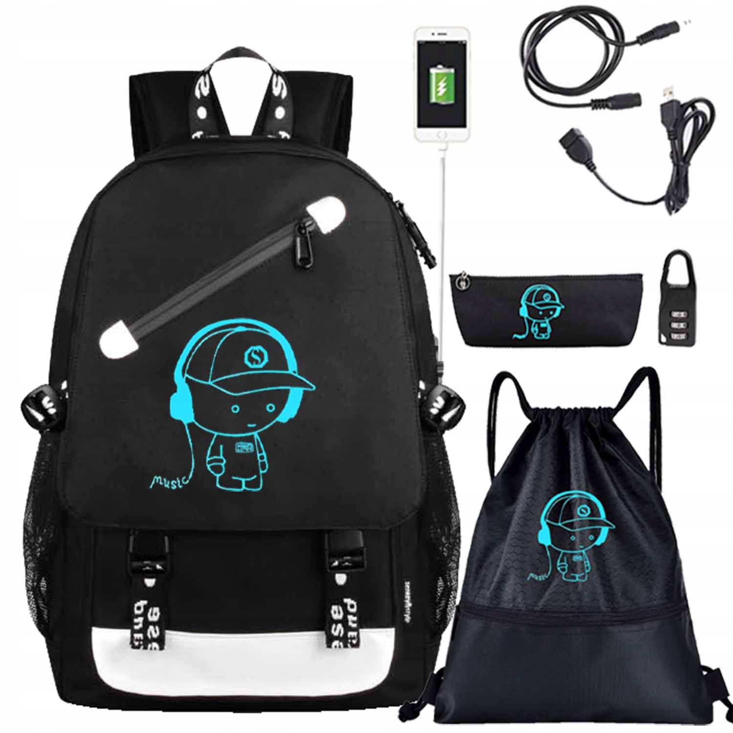 - Рюкзак комплектуется USB-кабелем, кабелем с разъемом для наушников и навесным замком для кода, светящимся пеналом, светящейся сумкой/сумкой.
