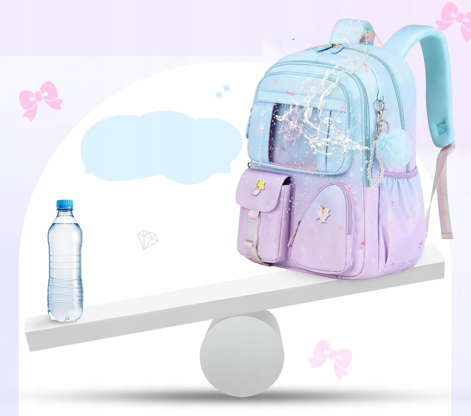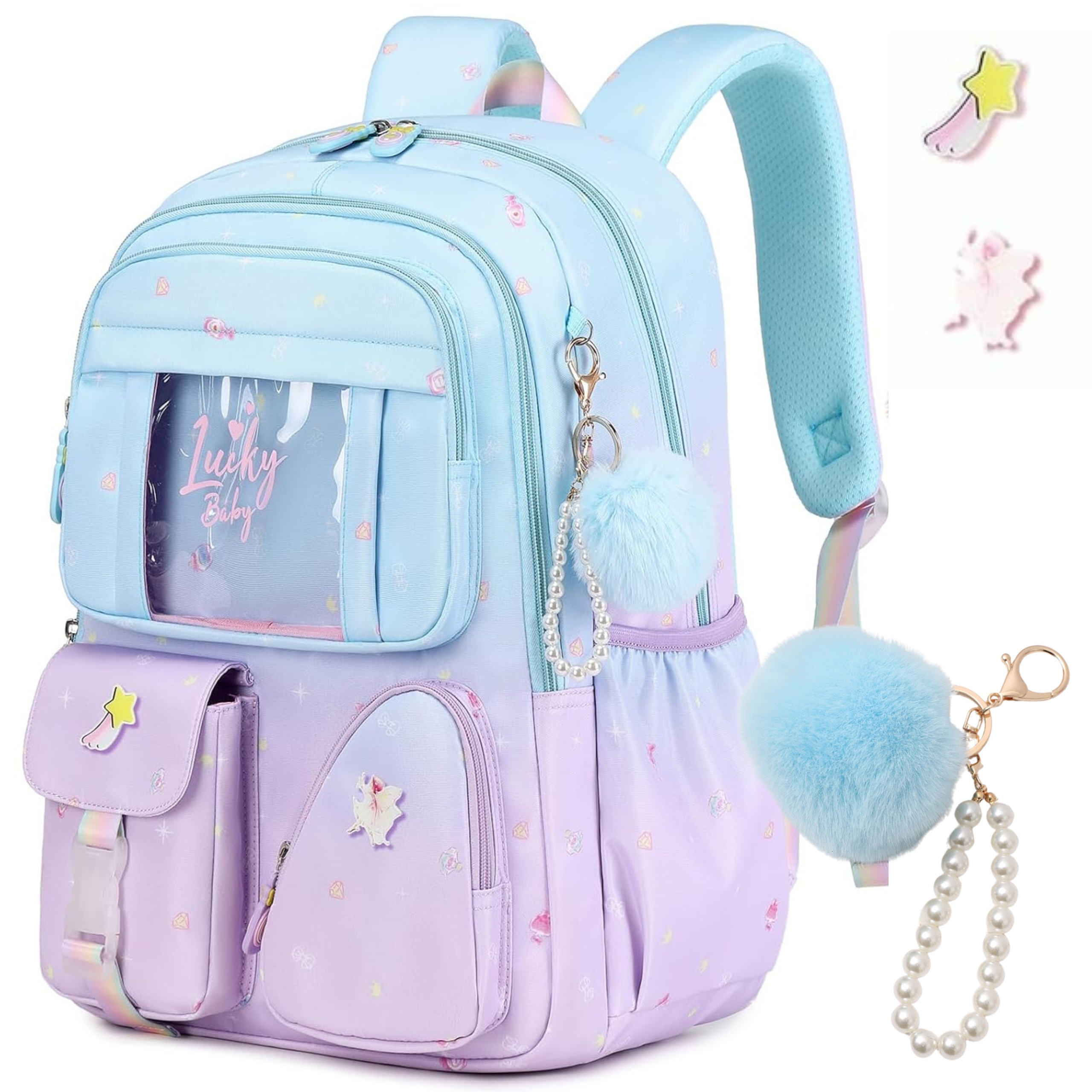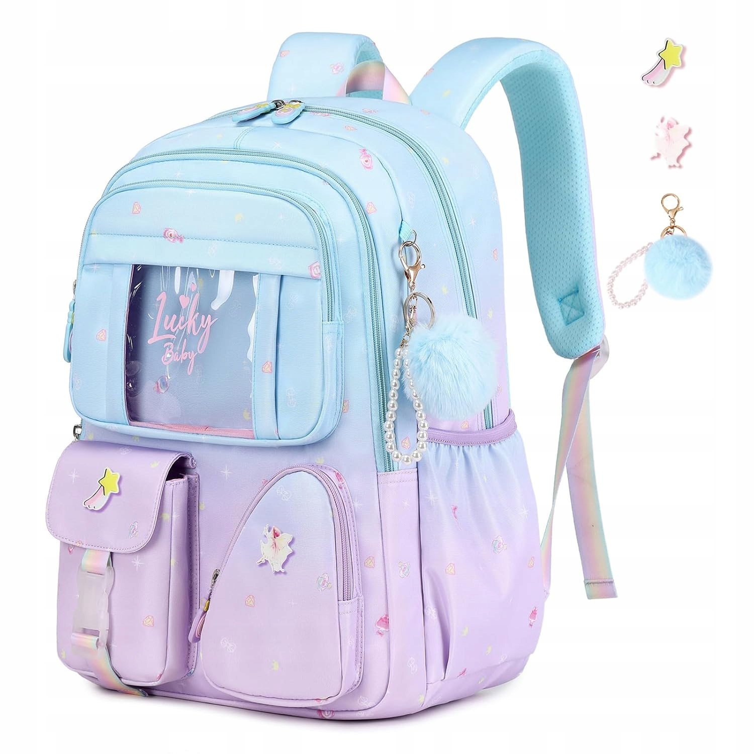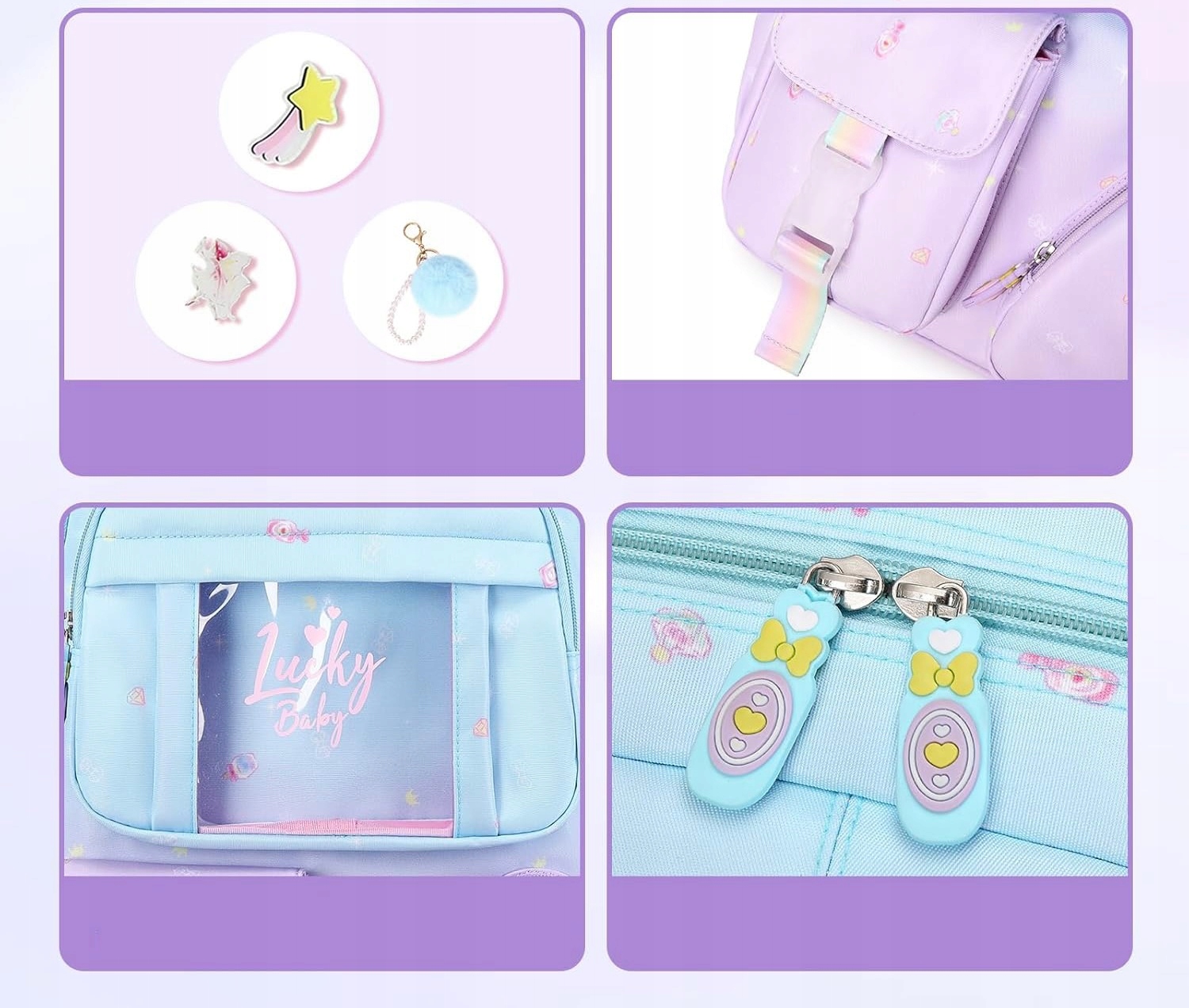 - 🎀 Аксессуары – брелок в комплекте (длина около 13 см), декоративные значки и передний карман с окошком.