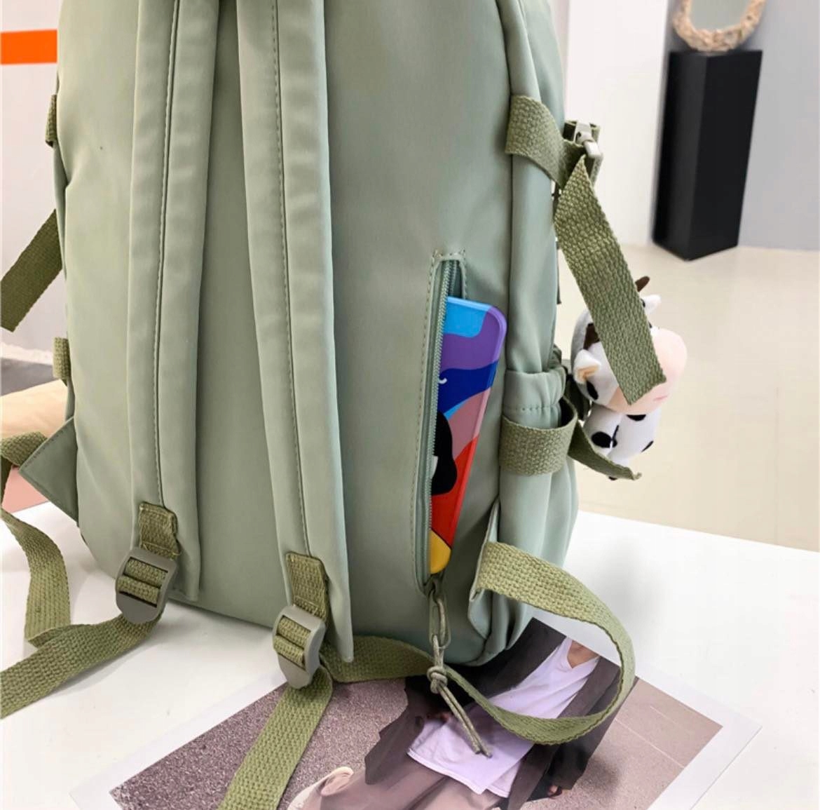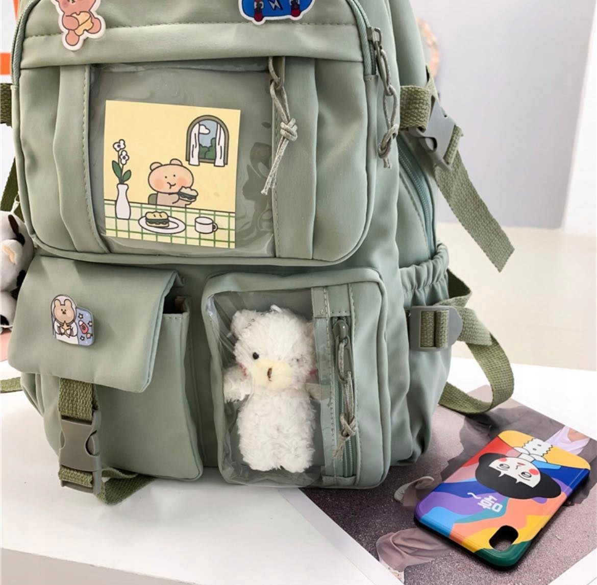- Рюкзак поставляется с замком + 2 брелками (плюшевый мишка и корова) + 3 булавки + карточка.