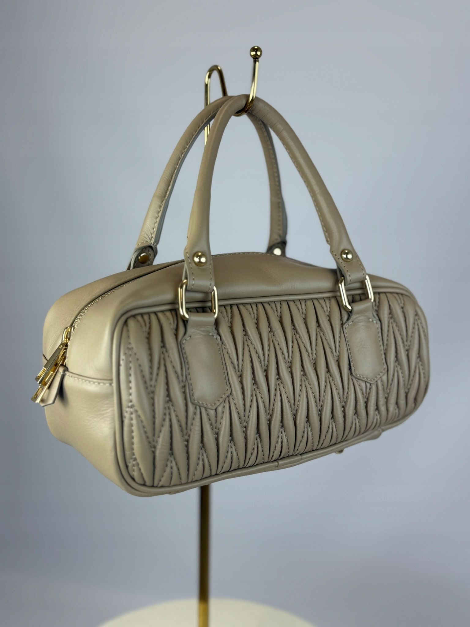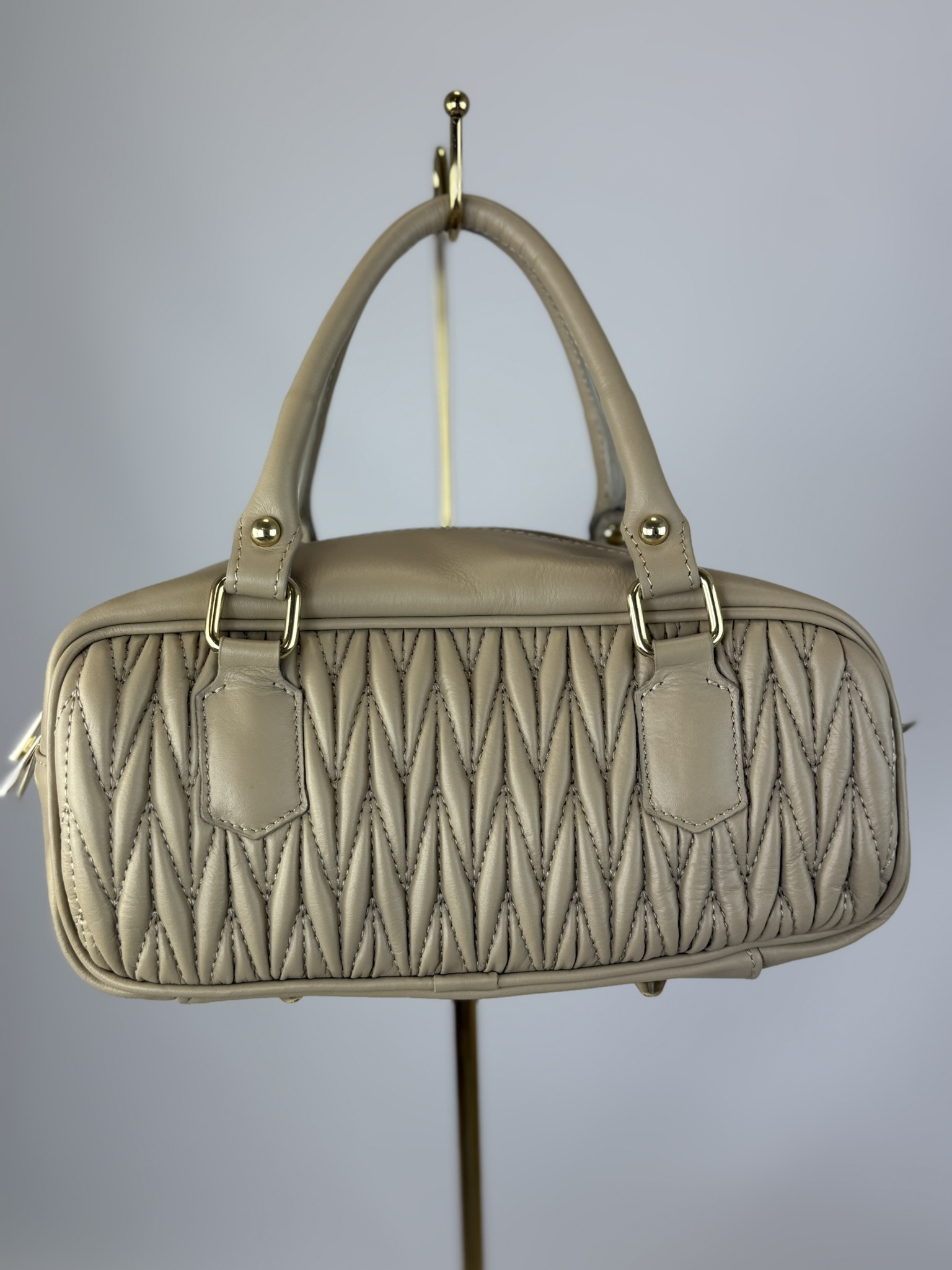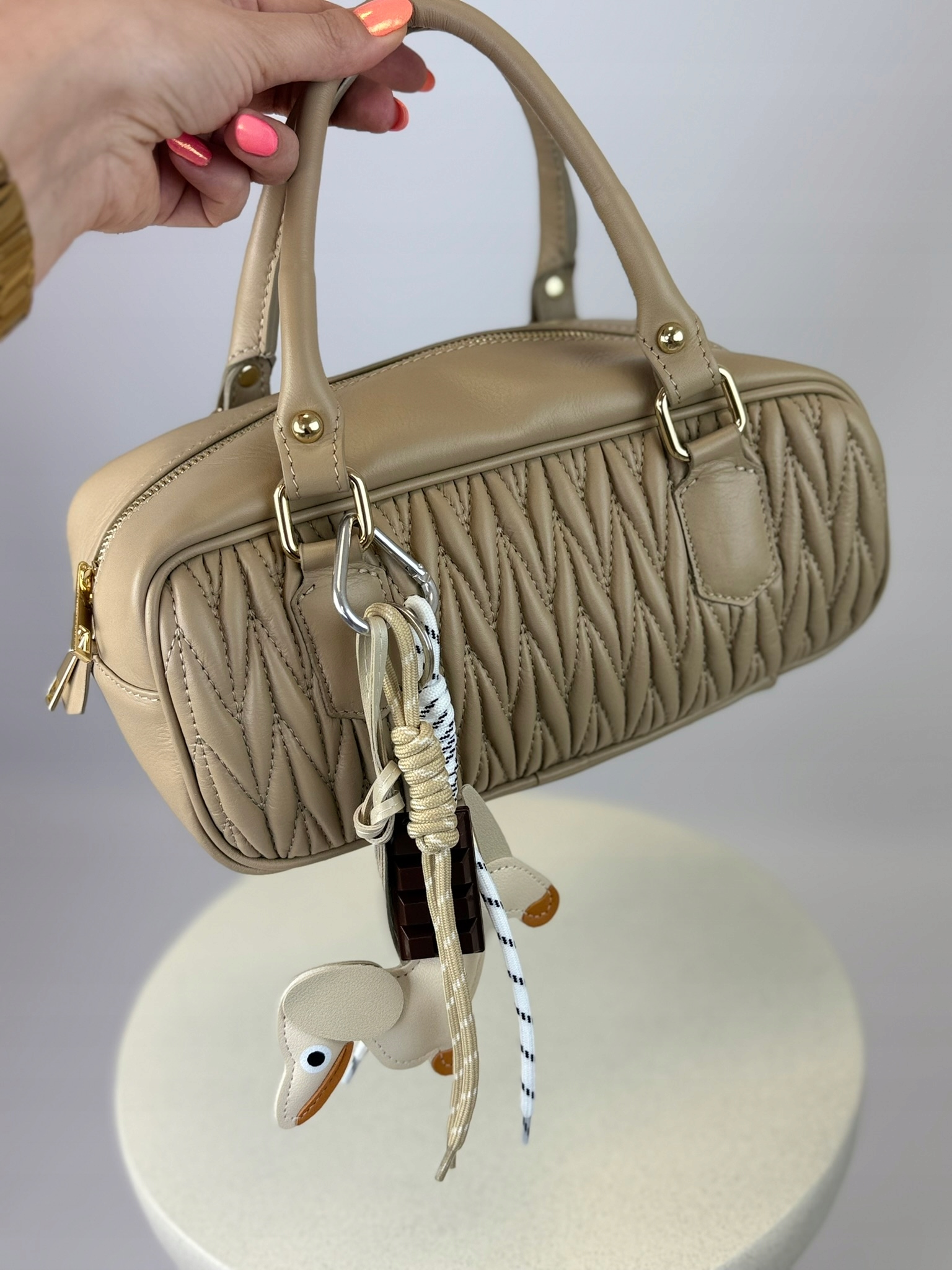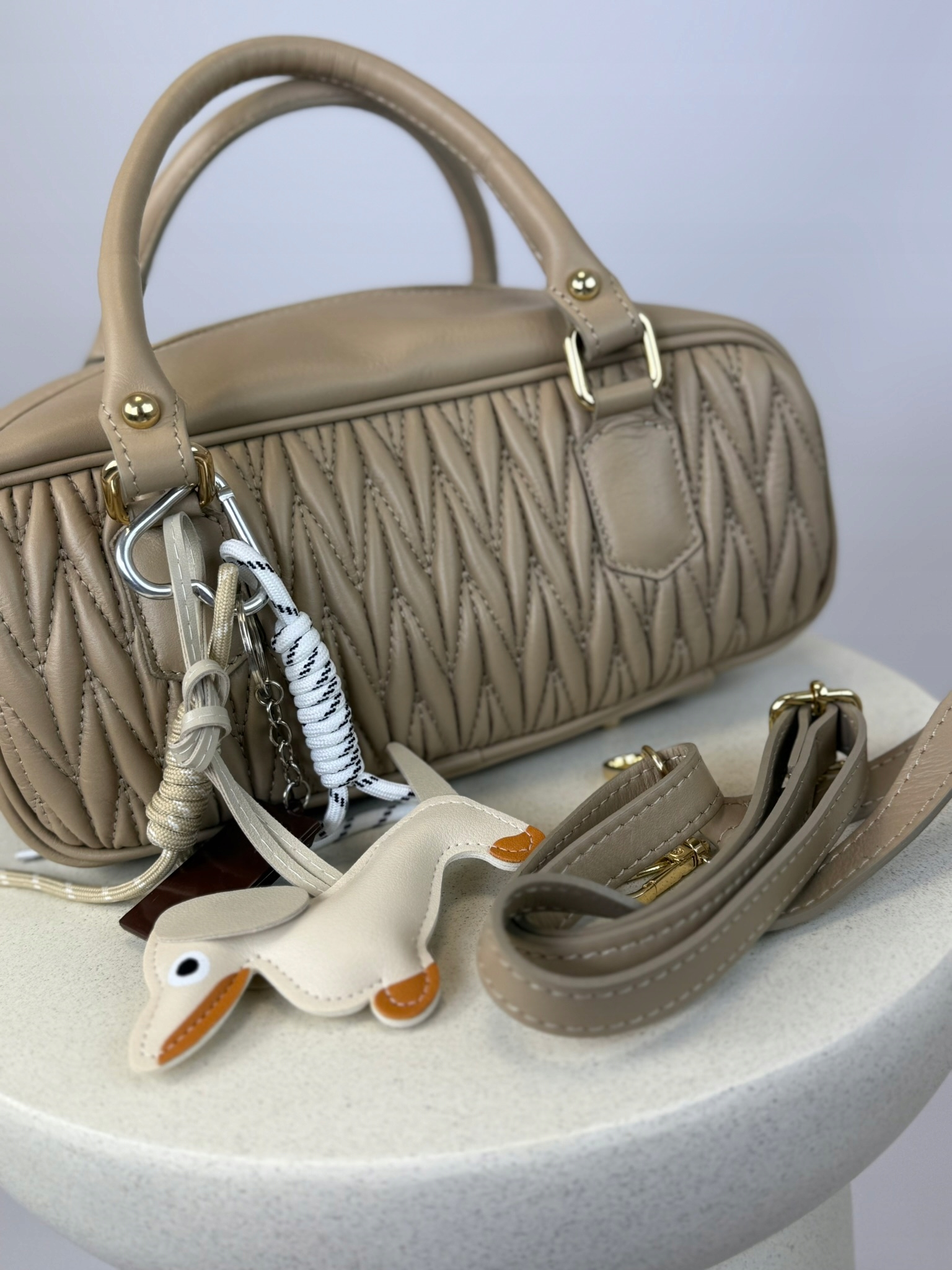 Оснащенный золотой фурнитурой, удобной ручкой и дополнительным плечевым ремнем, он сочетает в себе функциональность и стильную форму. Внутри сумки есть яркая тканевая подкладка и мини-карман для мелочей.