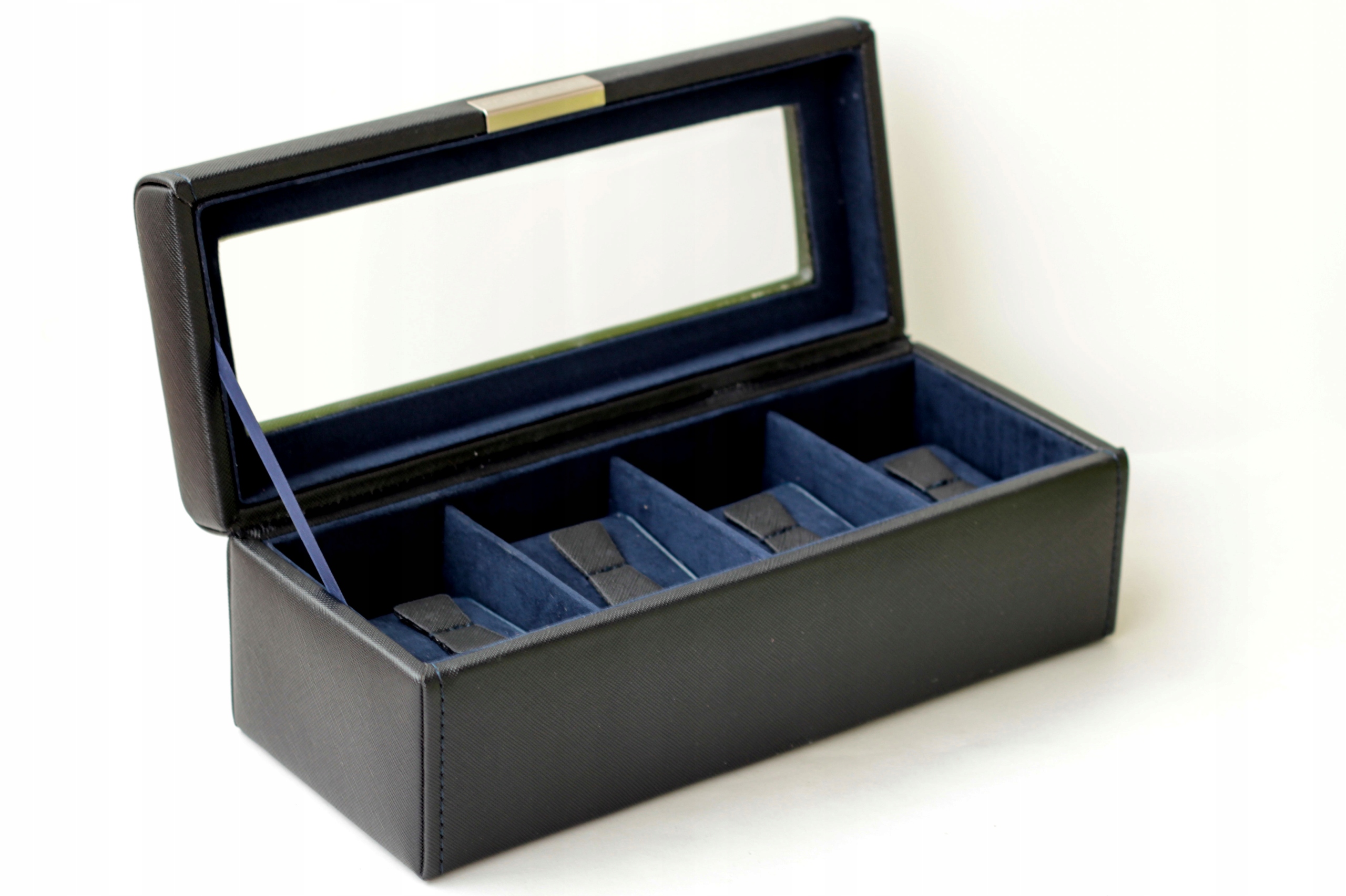 Кожаная коробка (футляр) на 4 часа с большим стеклом - черный синтетический материал с красивой крестообразной структурой. Коллекция Cross Grain.
