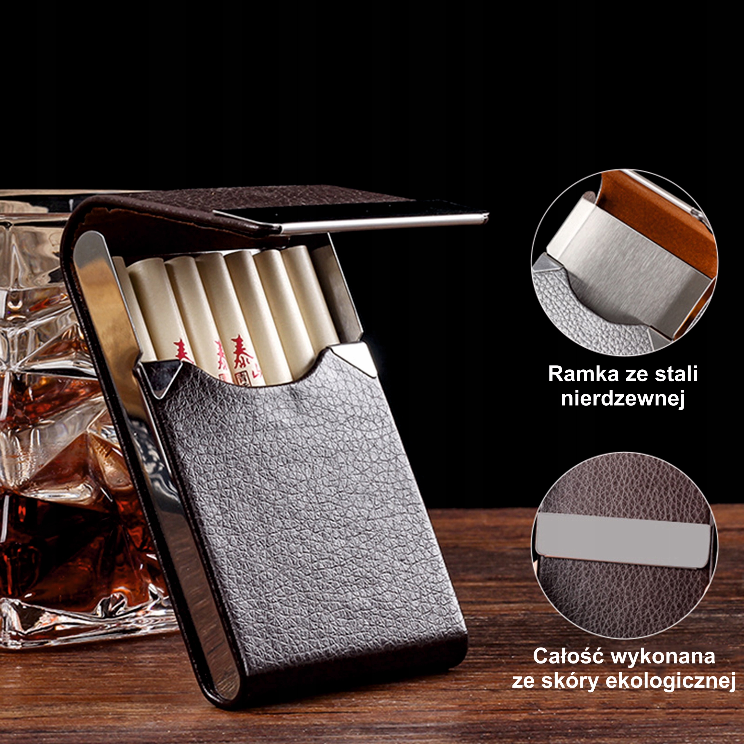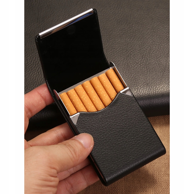 Предлагаем Вам уникальный портсигар, сочетающий в себе шик и элегантность. Наша портсигарка изготовлена из высококачественной экологической кожи. Стальные элементы отполированы до блеска, что подчеркивает роскошный характер изделия, а его несомненным преимуществом является возможность нанесения на поверхность тонкой и персонализированной гравировки по вашему выбору.