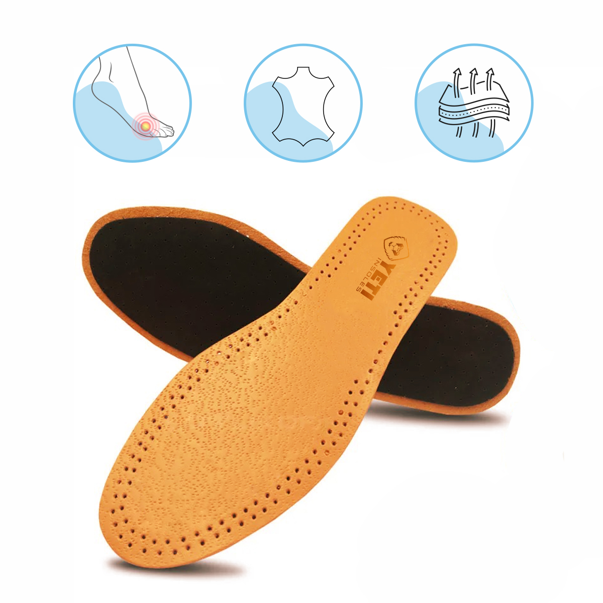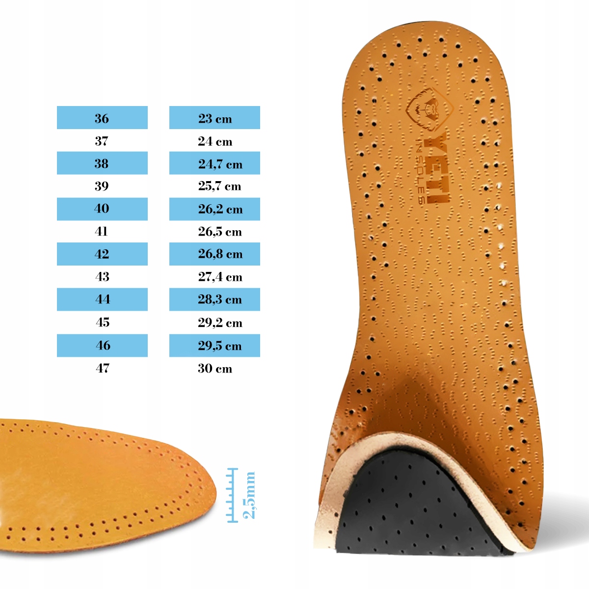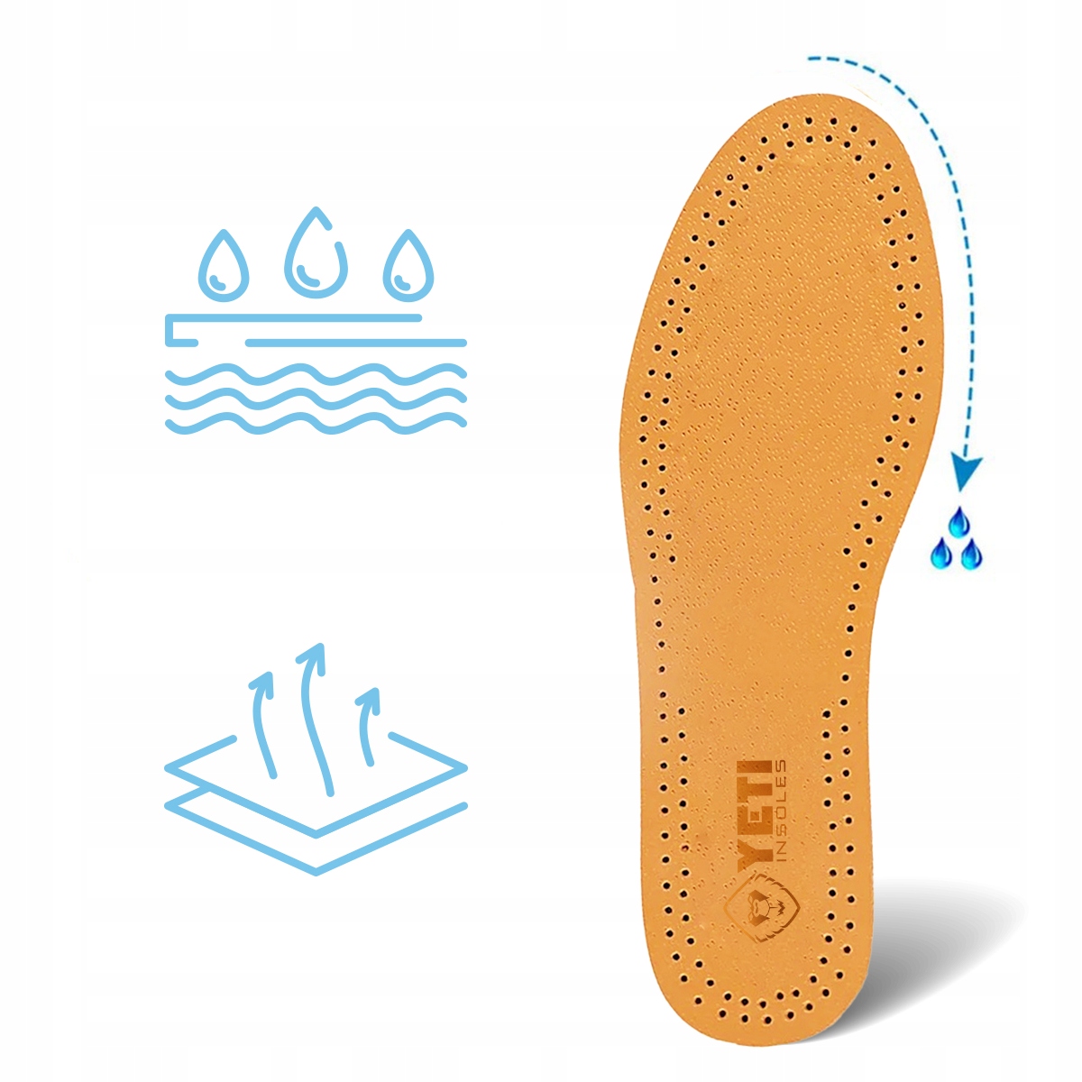 Кожаные вставки для обуви из натуральной кожи в сочетании с перфорированной латексной пеной, содержащей активный уголь-антиперспирант. Стельки бренда Yeti Insoles обладают антибактериальными свойствами и рекомендуются людям с чрезмерной потливостью ног.