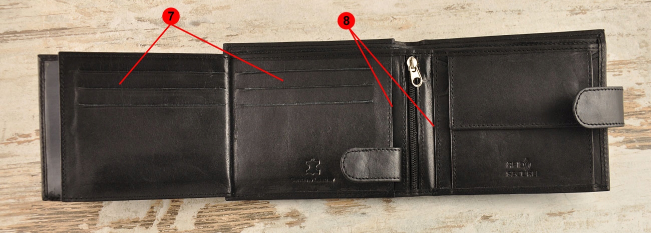 8 - два отделения для свидетельств о регистрации автомобиля в обложках, визиток и т.п.
