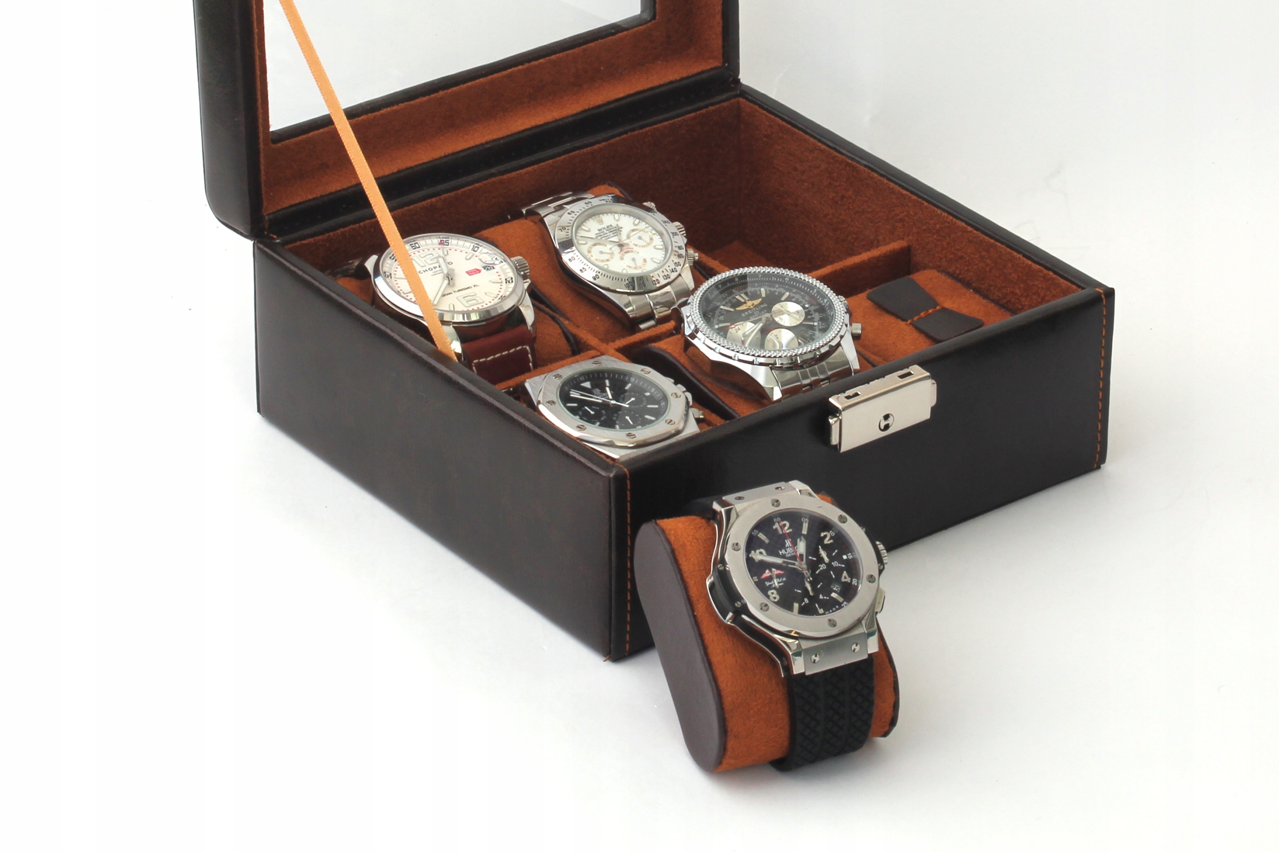 Кожаная коробка (футляр) на 6 часов с большим стеклом - коричневая экологическая кожа. Коллекция облигаций. Внутри коробки отверстие для кабеля зарядки умных часов. Немецкое производство - Фридрих/23. Идеальное качество изготовления. Большие, мягкие и идеально подогнанные подушечки для часов.