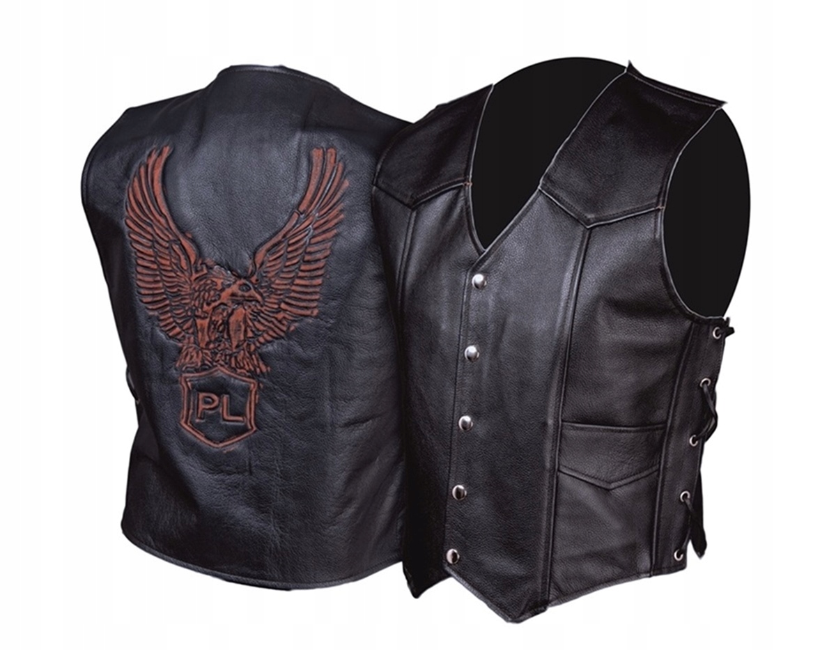 Кожаный мотоциклетный жилет модели KM002 от L&J RYPARD. Эта модель является одним из самых характерных и привлекательных мотоциклетных жилетов на польском рынке. Рельефный орел на спине «PL» — лучший способ показать патриотизм и привязанность к стране, из которой вы родом. Богатый рисунок и дизайн придают жилету неповторимый и неповторимый стиль. Застегивается на стальные кнопки хромированного цвета, на подкладке из полиэстера, который изолирует кожу от лица, предотвращая ее прилипание и натирание. Завязки по бокам позволяют легко подогнать размер под фигуру каждого покупателя. Отличный и проверенный выбор для каждого мотоциклиста, ценящего уникальность.