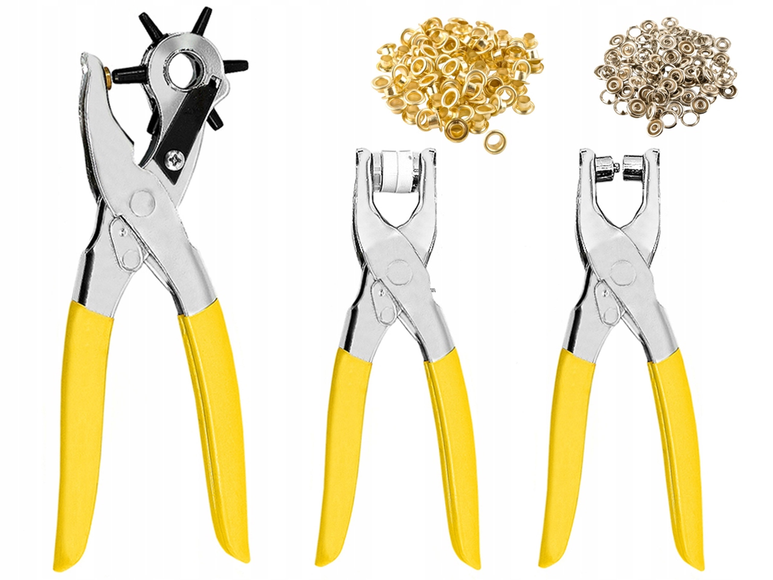Дополнительные аксессуары включают в себя 100 штук заклепок и столько же количество снимков. Галантерейная продукция непременно поможет в реализации собственных, разнообразных и творческих проектов. Изделие идеально подходит для проделывания отверстий, например, в ремнях, а также для расклепывания курток, пальто или обуви, а также застегивания кнопок на многих типах тканей.