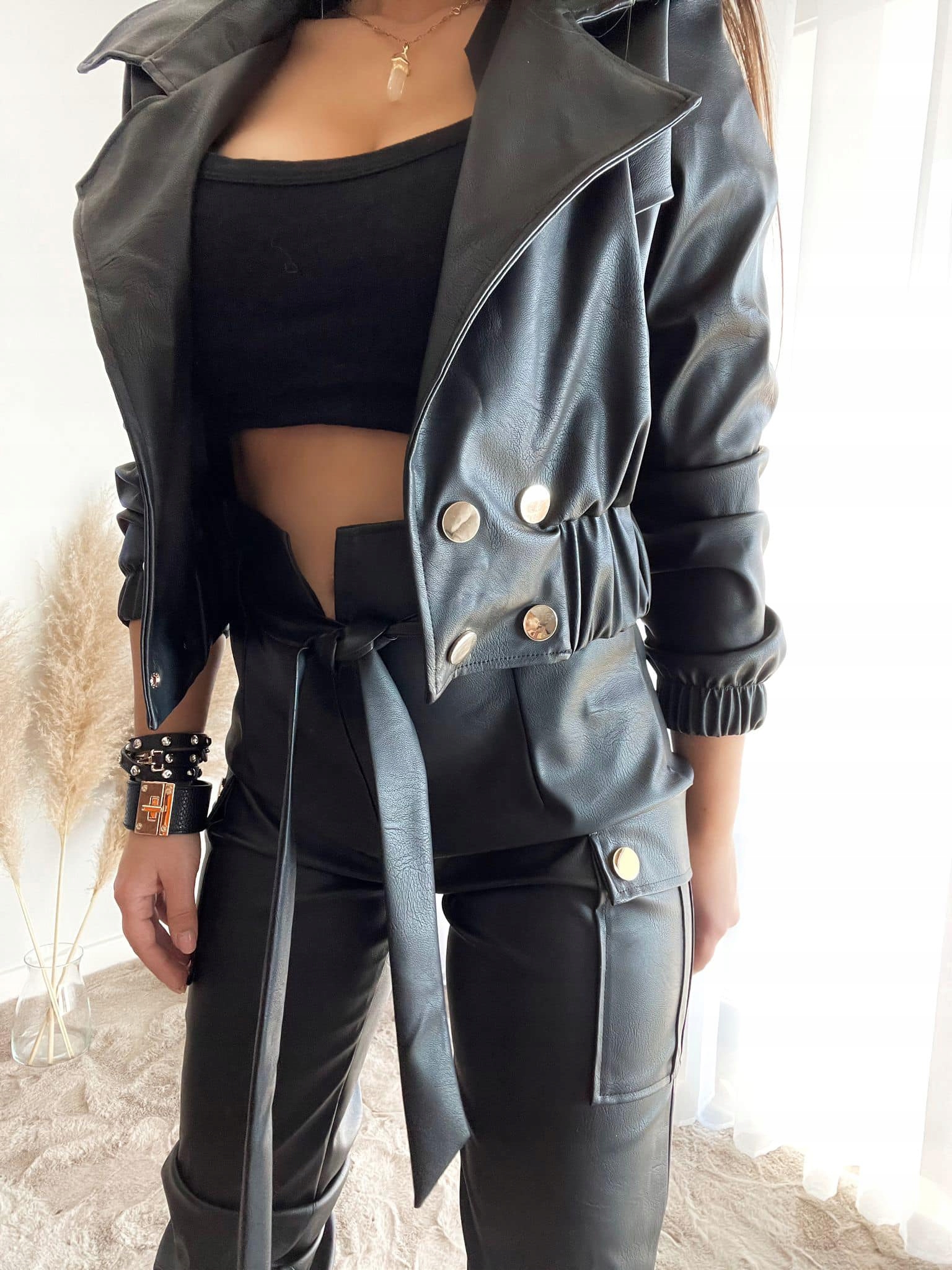 Оригинальная куртка из экокожи интересного кроя.