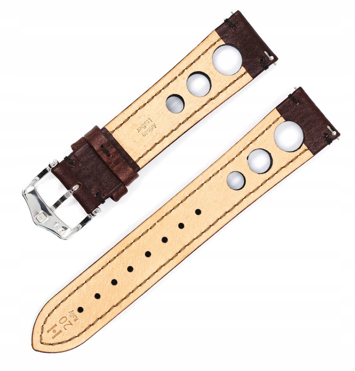 Коричневый кожаный конический матовый перфорированный водонепроницаемый ремешок для часов из кожи HIRSCH Vintage Rally Artisan. Ширина 20 мм. Антиаллергенная пряжка. Подходит ко всем часам со стандартным креплением шириной 20 мм. Телескопы в комплекте.