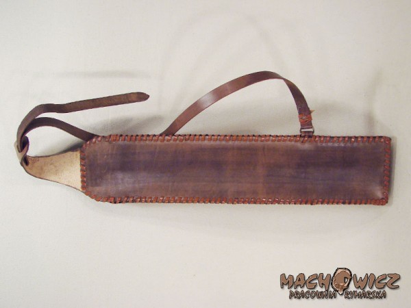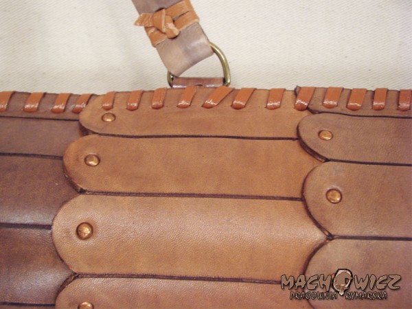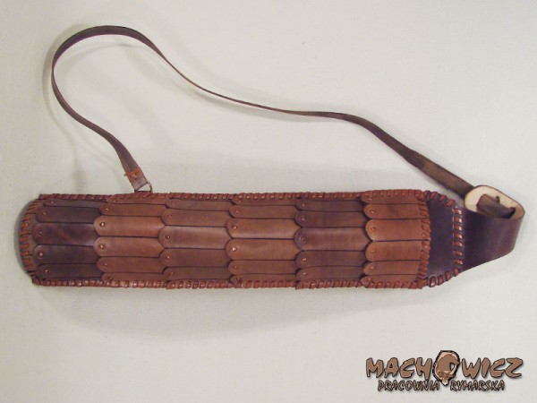 Колчан изготовлен из жесткой глухой кожи толщиной 2,5 - 3 мм. Передняя часть колчана выполнена из кожаных накладок, дополнительно усиленных декоративными медными заклепками. Верх и низ усилены двойной заготовкой из кожи. Все это прошито вручную кожаными ремнями. Плечевой ремень гладкий, крепится декоративной тесьмой.