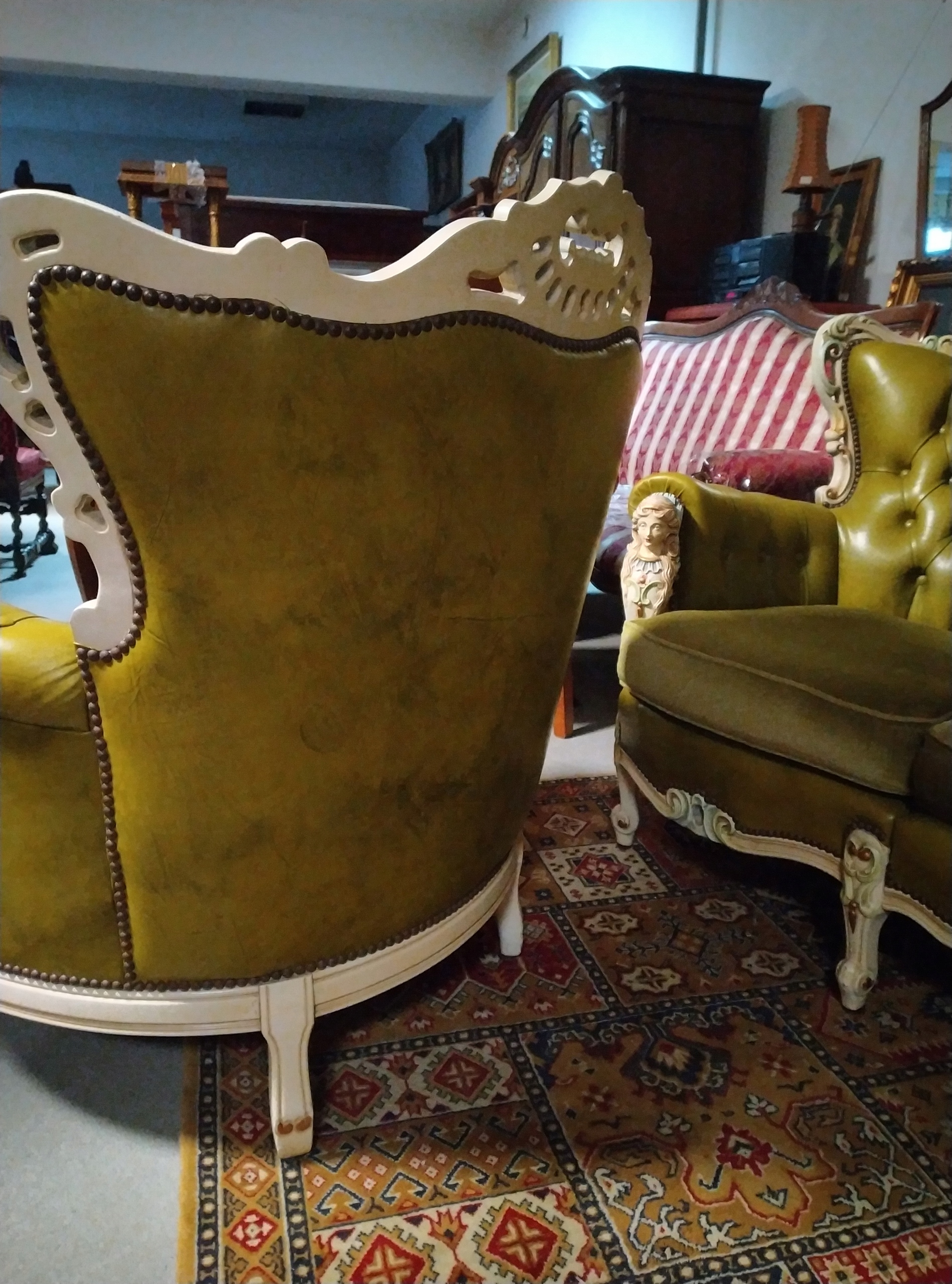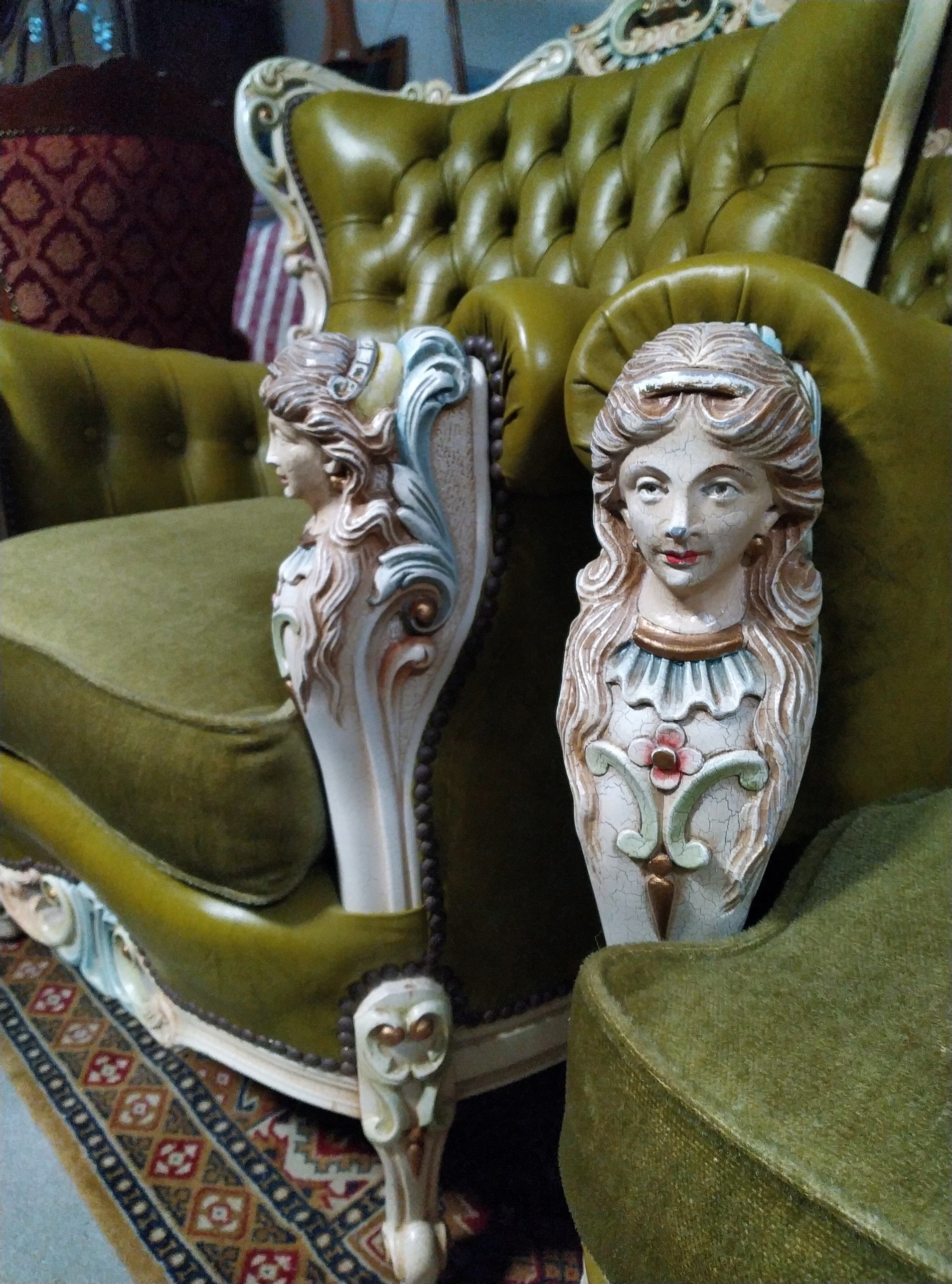 Предлагаю на продажу уникальный оригинальный диванный гарнитур Louis France Palace. В комплект входит 4-местный диван и два кресла. Комплект выполнен из высококачественной зеленой кожи, сиденья из верблюжьей ткани, орехового дерева, подлокотники украшены красивой резьбой, дополнительные подушки спинки на сиденьях. Полукруглый диван, для транспортировки складывается на 3 части. Сиденья с ремнями и пружинами.