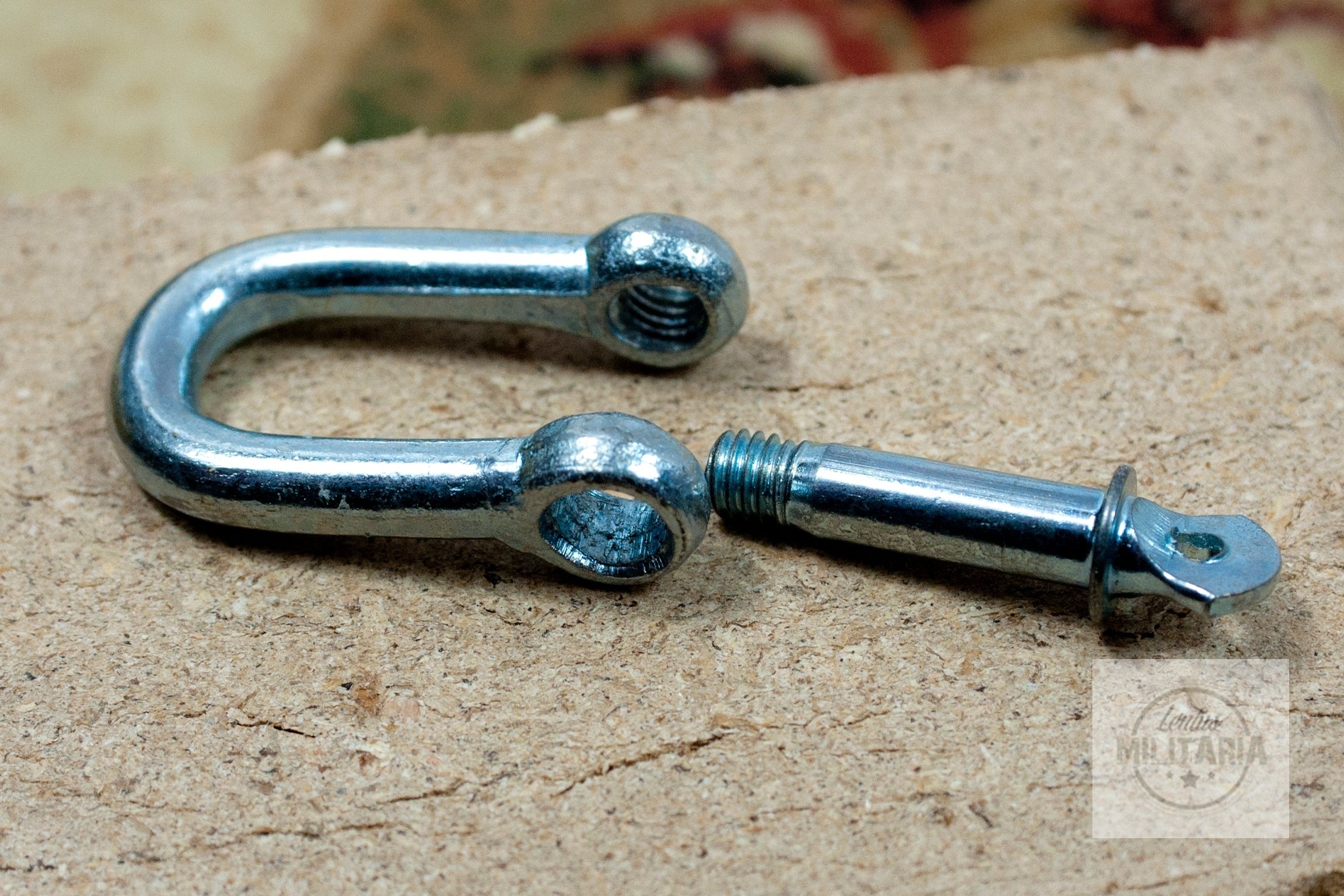 Скоба из оцинкованной стали в форме буквы «U» с замкнутой окружностью, открывается и закрывается с помощью винта с завинчивающейся проушиной (штифт с резьбой, ввернутый в корпус). В проушине имеется просверленное отверстие, в которое можно продеть страховочный трос. Один из самых распространенных способов крепления и соединения веревок с проушинами. Он также идеально подходит для подсоединения таких аксессуаров, как крючок, талреп и т. д.