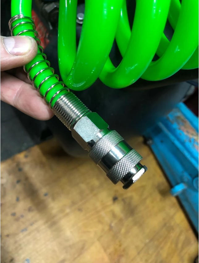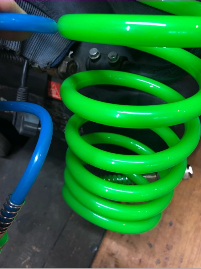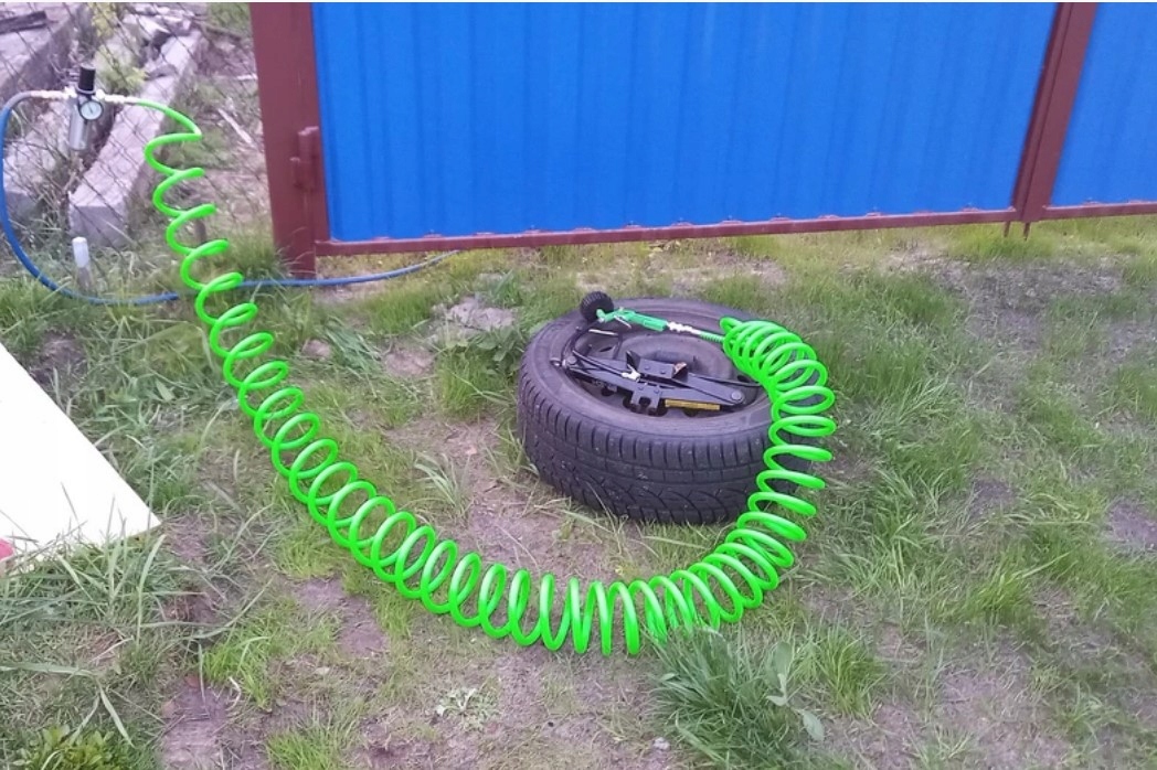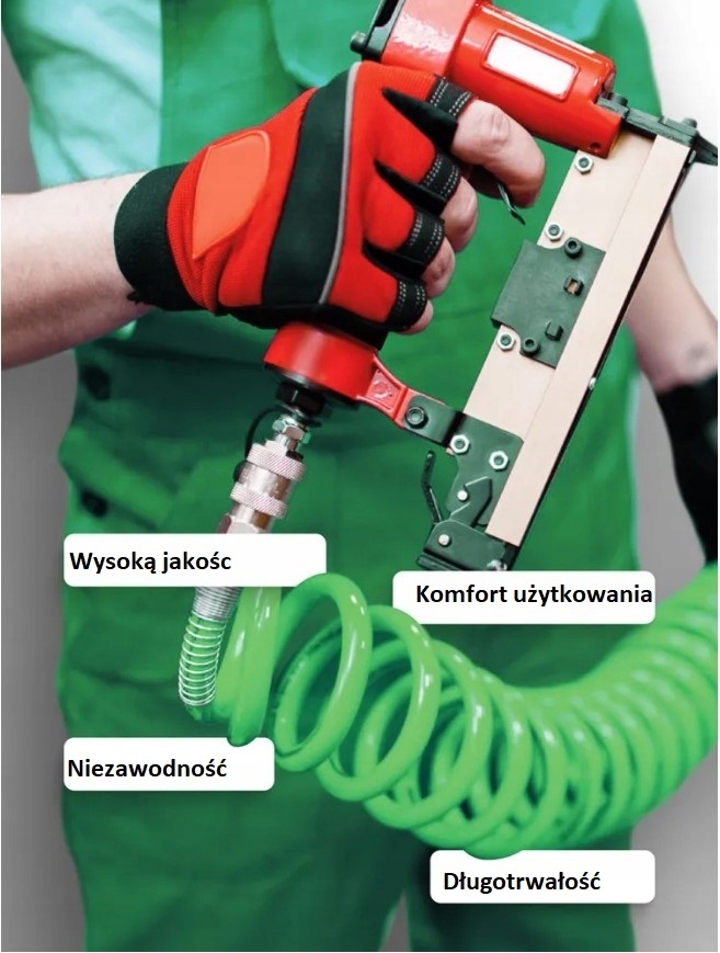 Пневматический шланг оснащен дополнительной защитой в виде стальных пружин, предотвращающих разрыв шланга в местах крепления, внутренним диаметром 10 мм и наружным диаметром 14 мм. Также благодаря армированию изделие выдерживает высокое давление сжатого воздуха до 24 бар, рабочее давление 8 бар. Быстроразъемные соединения изготовлены из латуни, устойчивой к коррозии и деформации. Комбинация быстроразъемных соединений обеспечивает удобство и долговечность. Зона крепления быстроразъёмов усилена во избежание перегибов и трещин.