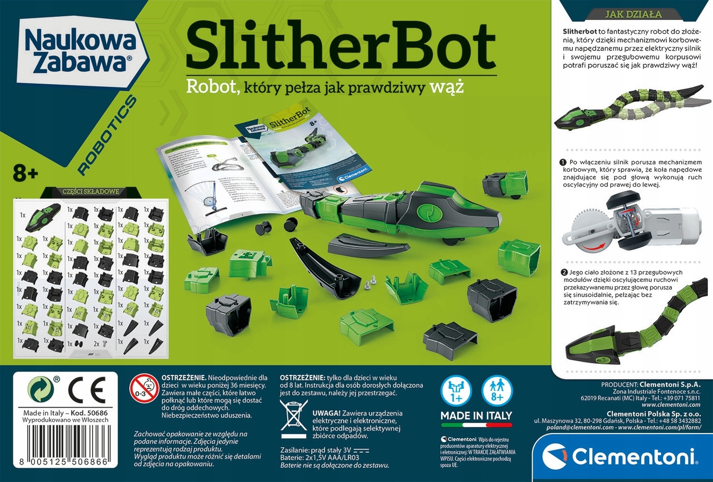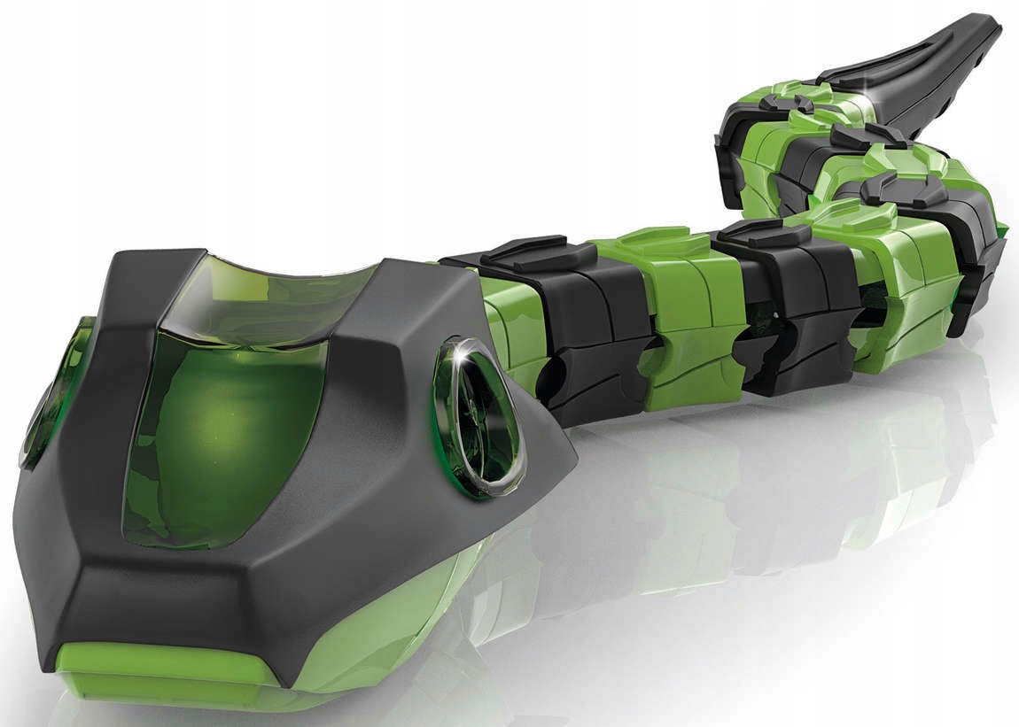SlitherBot — зелено-черный змееподобный робот, который ходит независимо и передвигается ползком. Набор состоит из 28 элементов, включая двигатель с каскадным редуктором и кривошипно-шатунный механизм, благодаря которому робот будет передвигаться.