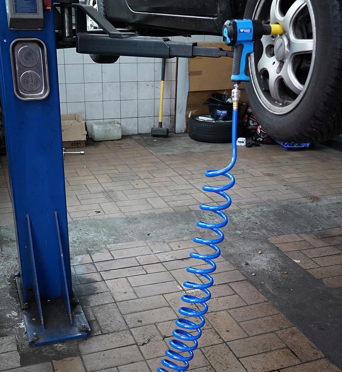 Спиральный пневматический шланг длиной 10 м синего цвета. Необходим для работы с каждым компрессором. Благодаря быстроразъемным соединениям к нему можно подключить любое пневматическое устройство: манометр, обдувочный пистолет, малярный пистолет, масленки, пневматический ключ, пневматический лубрикатор.