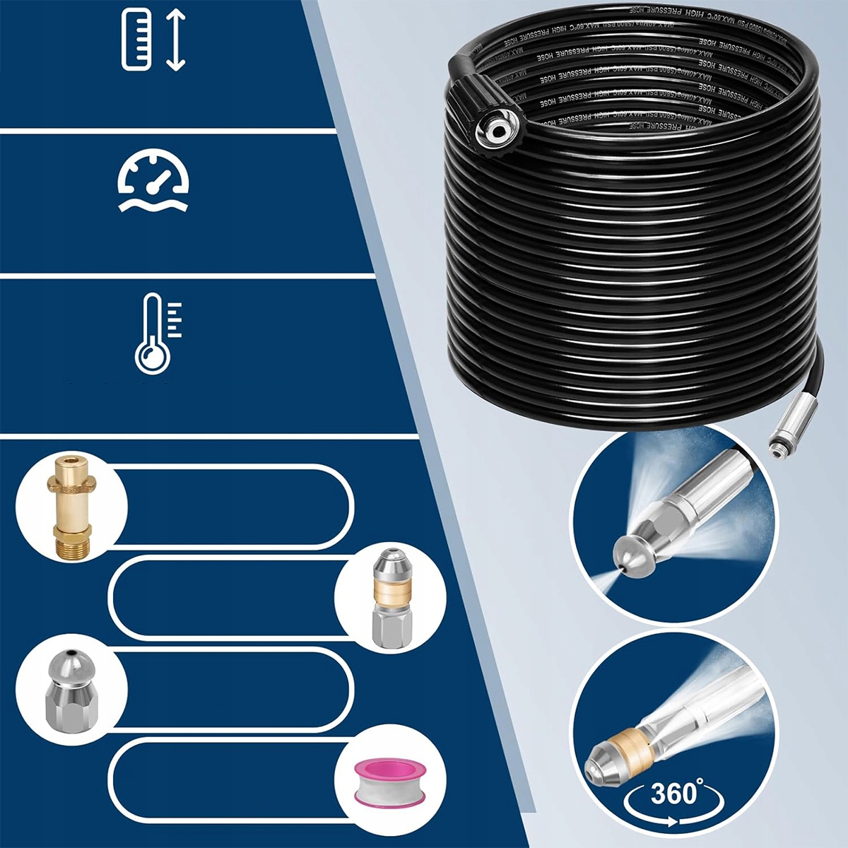 ✅ 【широкое использование】 Этот шланг был специально разработан для очистки труб. Он может удалить постоянную грязь, разблокировать желоба и отток, разблокировать дренажные трубы, снять краску и песок. Он чрезвычайно гибкий, прост в использовании и автоматически скрывается в трубе через сопла, направленные назад. Для работы устройства требуется шайба с высоким давлением. Максимальное давление: 400 бар.