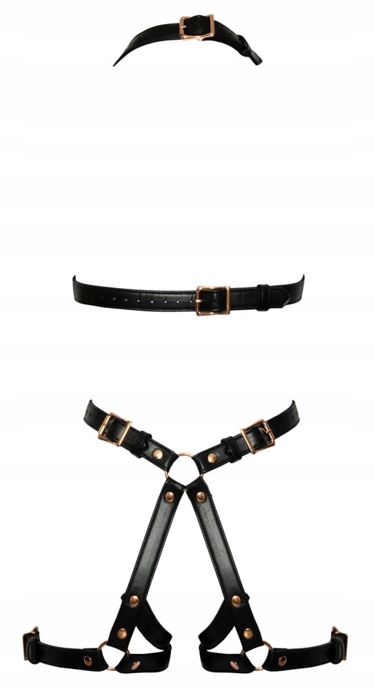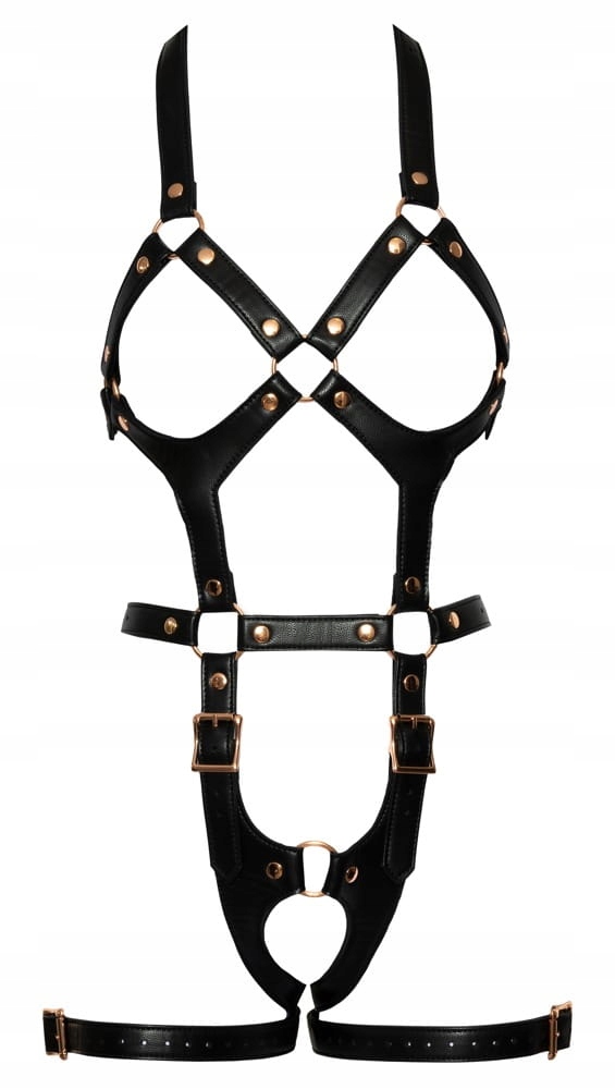 Шлейка с открытой чашкой без промежности имеет завязку на шее. и ремни вокруг бедер.